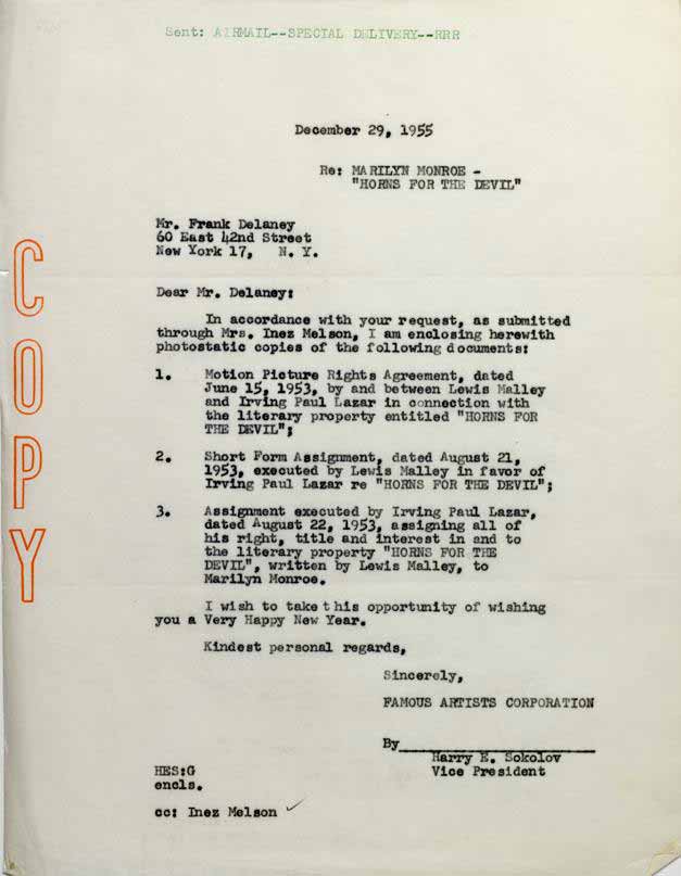 Lettre de Harry Sokolov de la Famous Artists Corporation du 29 décembre 1955 .