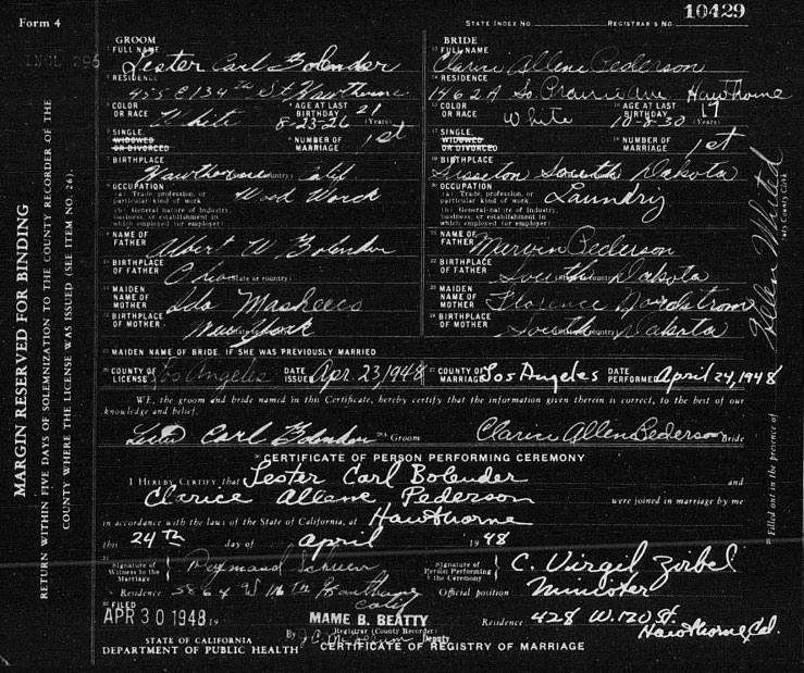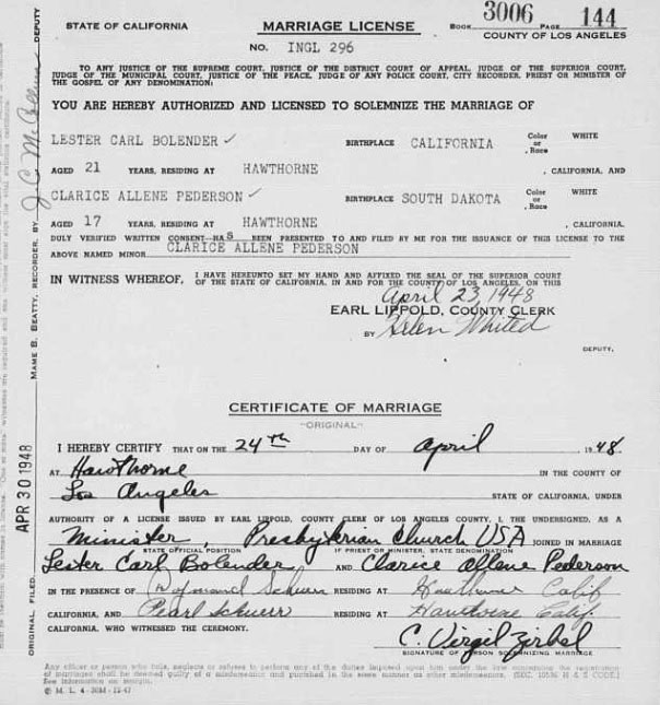 On April 23, 1948 Lester married Clarice Allene Pederson (,
