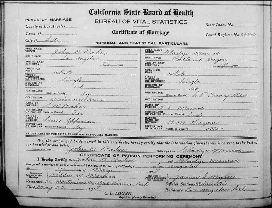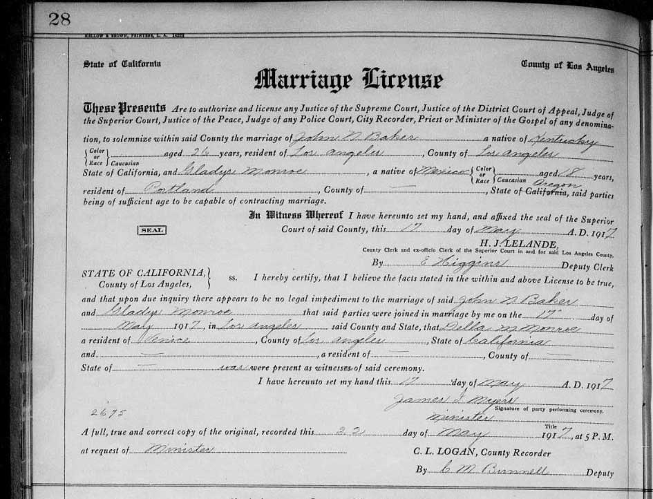 Le 17 mai 1917 il épousa Gladys Monroe. Della Monroe déclara que sa fille avait 18 ans (elle en avait en fait