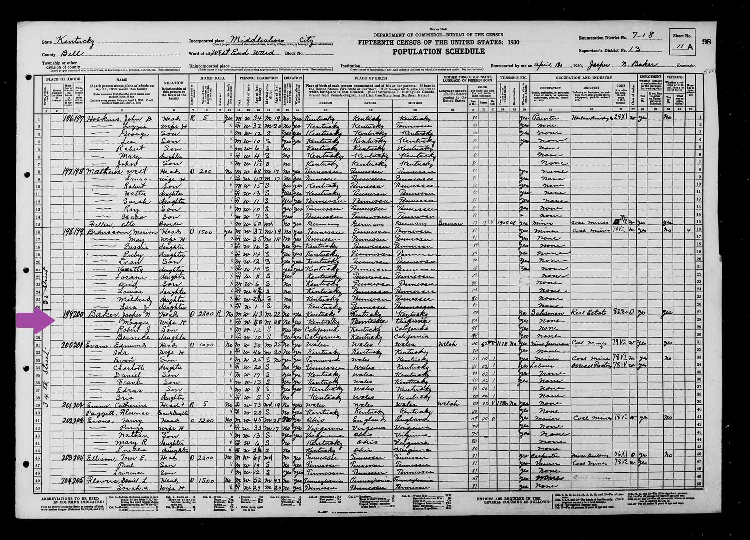 Ses parents étaient John Elliott Baker (27 avril 1855, Kentucky - 31 mars 1929, Kentucky) et Etta Epperson (25 septembre 1866, Kentucky - 1er octobre 1937, Kentucky).