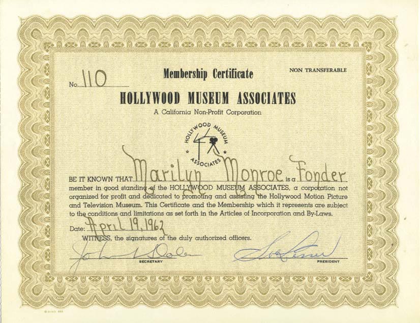 Certificate of Marilyn's membership of the Hollywood Museum Associates, dated April 19, 1962