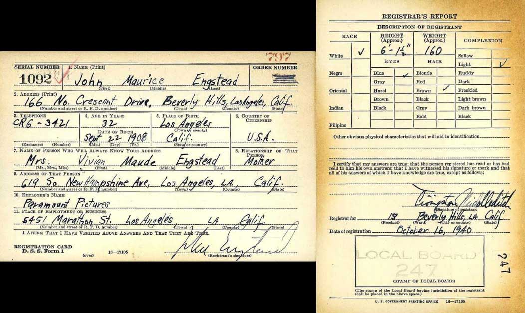 His parents Nilson Engstead (September 22, 1868, Sweden-February 10, 1938, Los Angeles)() and Vivian Maude Griggs (August 9, 1877, Illinois-October 21, 1959, Los Angeles) married on January 14, 1904, Chicago, Illinois.