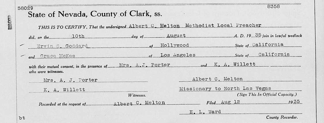 They got married on August 10, 1935 in Las Vegas (); Kirby Allen Willett, Grace's maternal uncle, who was one of their witness.