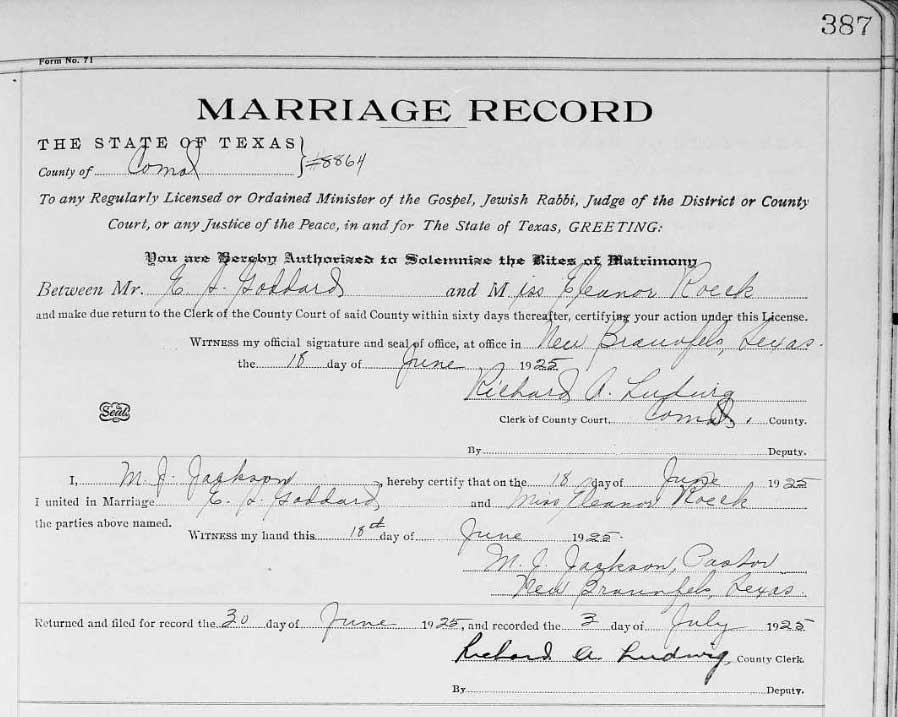 On June 18, 1925 he married Eleanor Barbara Maronde Roeck (October 18, 1917, Texas-May 16, 1983, Los