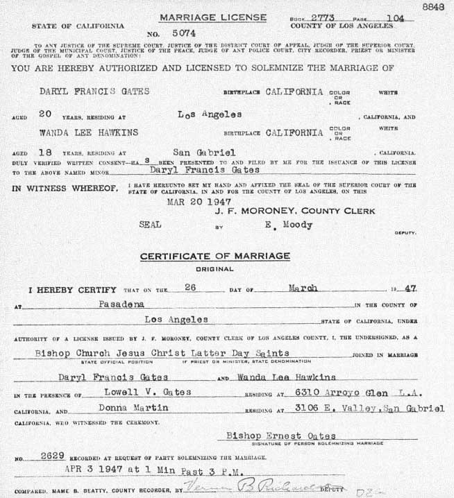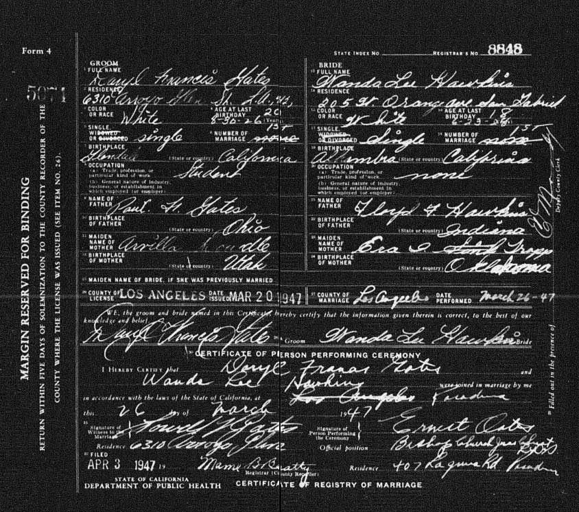 On March 26, 1947 he married Wanda Lee Hawkins (born on June 23, 1928, California)(-