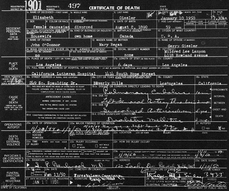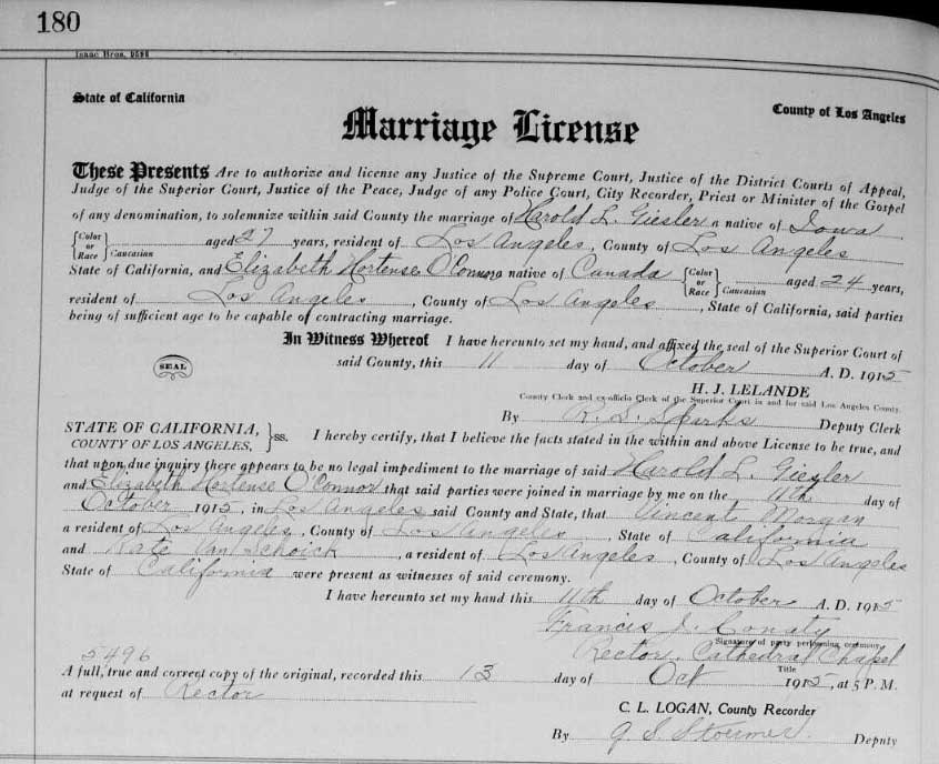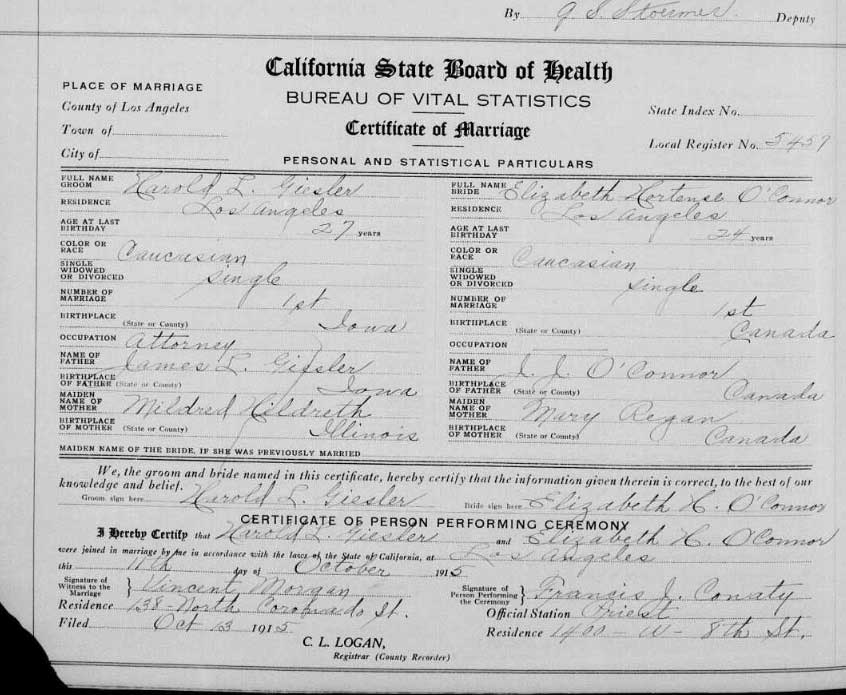 October 11, 1915 he married Elizabeth Hortense O'Connor (August 8, 1890, Canada-January 10, 1950, Los