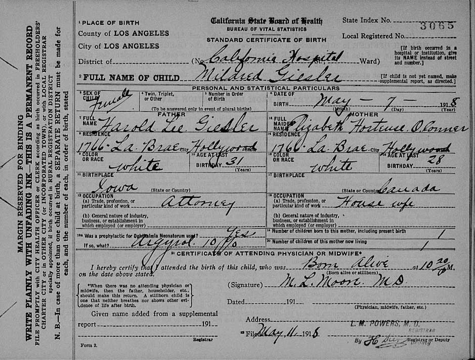 They had a daughter, Mildred Lee (May 7, 1918, Los Angeles-February 3, 1977, California)(). They divorced in 1928.