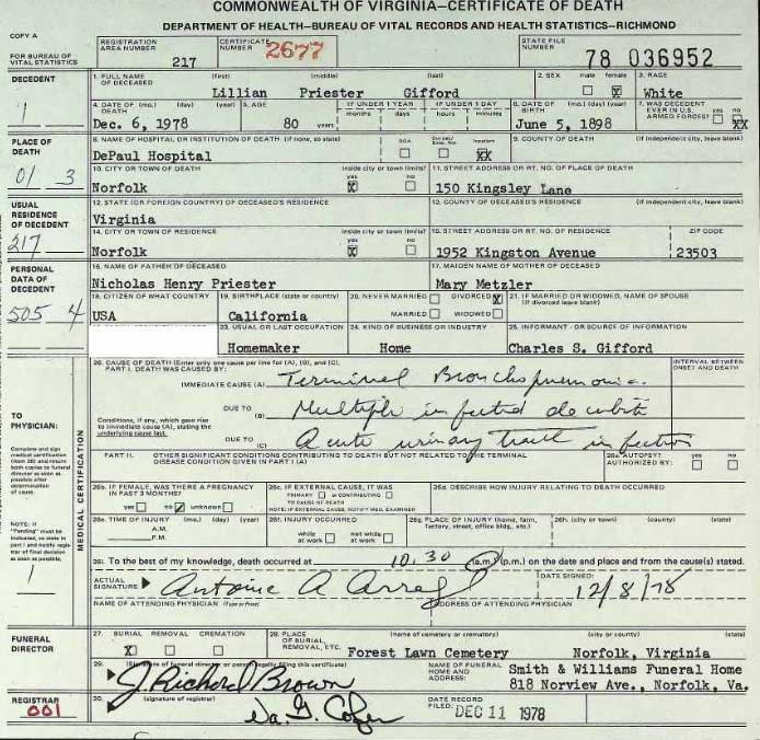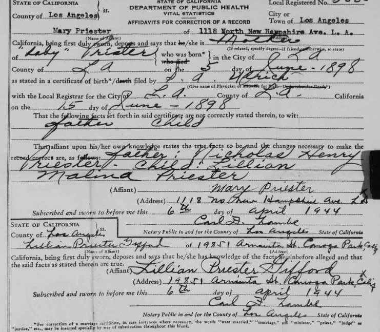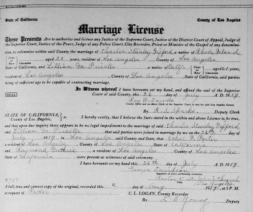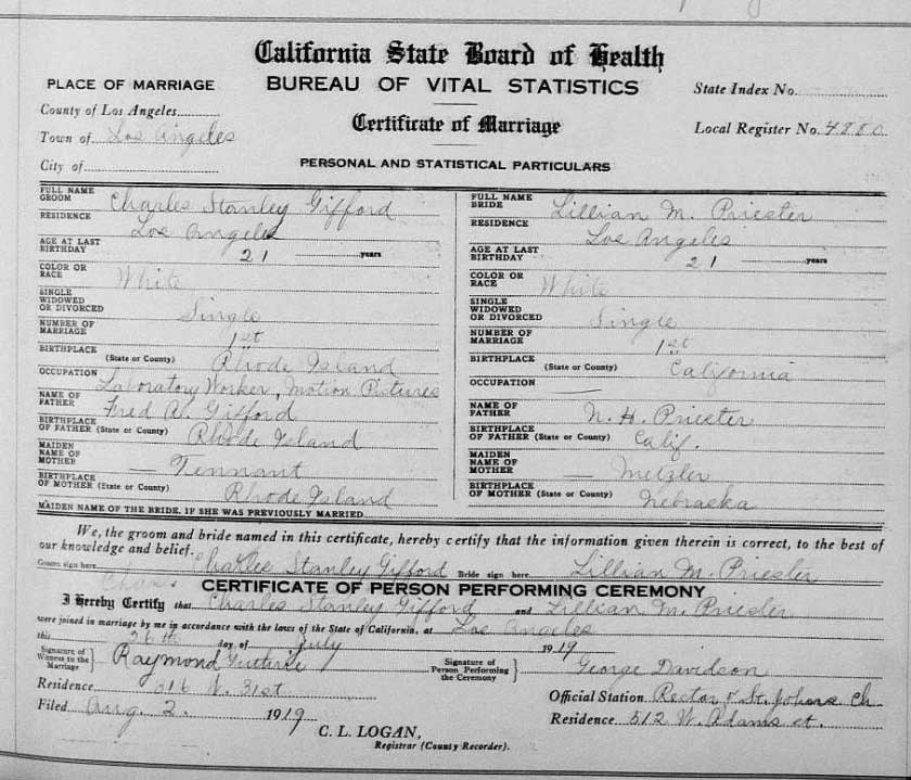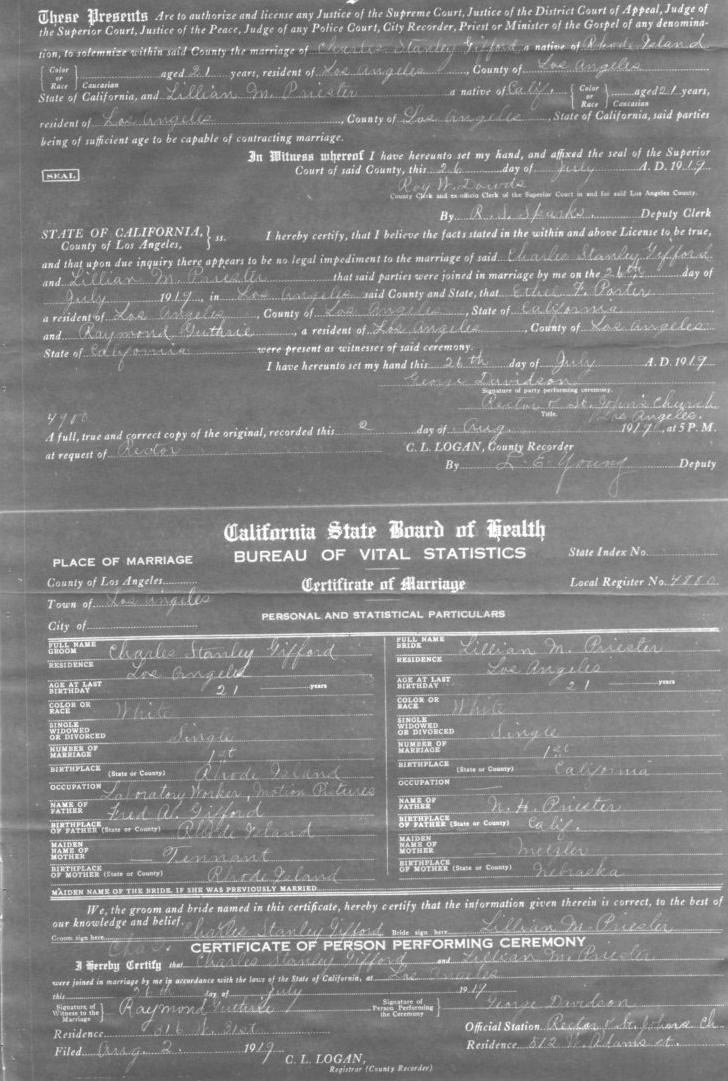 On July 26, 1919, he married Lillian Malinda Priester (June 5, 1898, Los Angeles -December