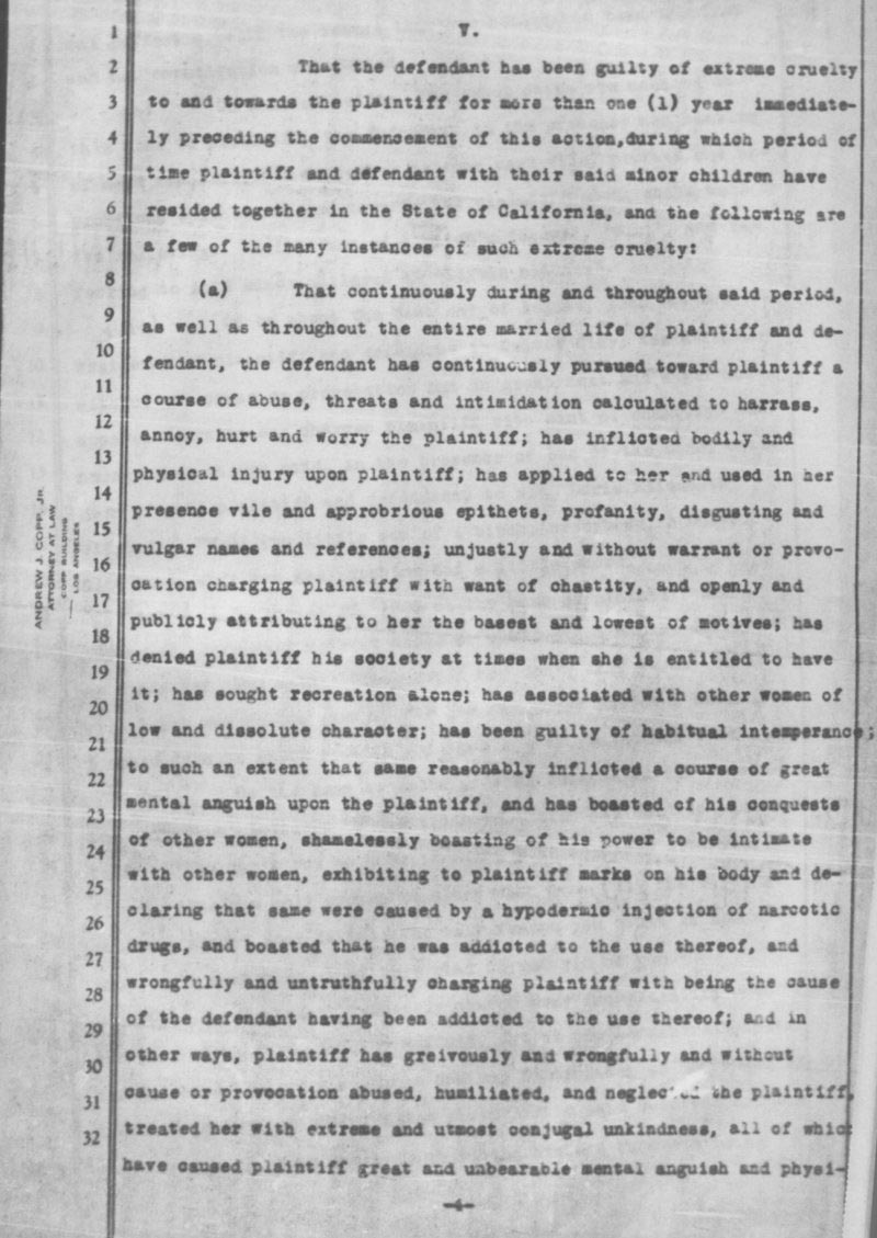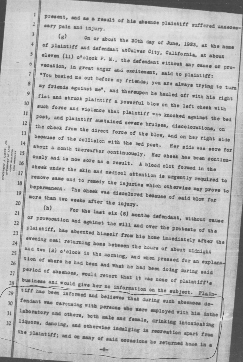 She left him in October 1923 and in the divorce statment in May 1925, he admitted "to have boasted with no decency about his feminine conquests".