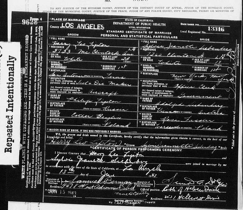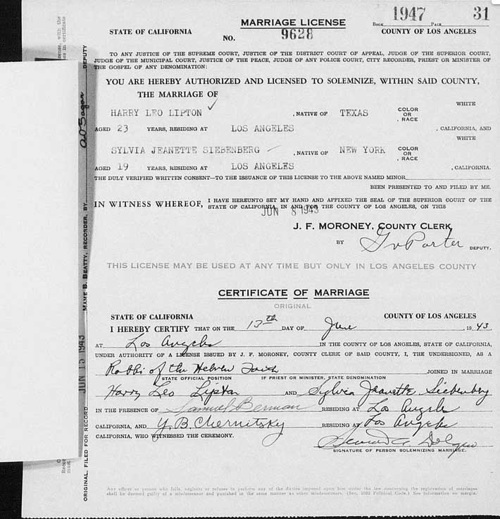 En 1943 il épousa Sylvia Jeannette Siebenberg (née en 1924, New York-8 décembre 2014, Los Angeles)