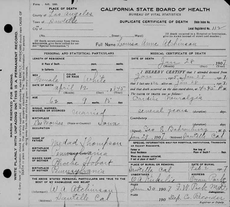 Her parents were William Allis Atchinson (August 30, 1837, New York-May 29, 1911, Los Angeles) and Louisa