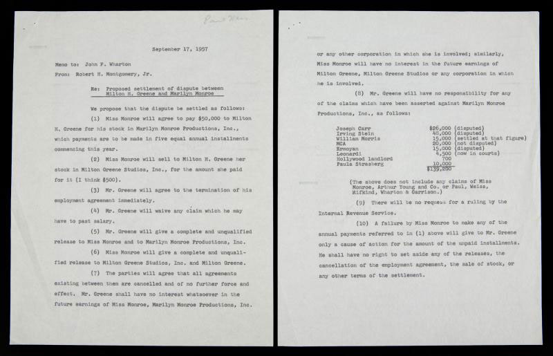 Letter about Milton Greene's break-up from the Marilyn Monroe Productions dated September 17, 1957