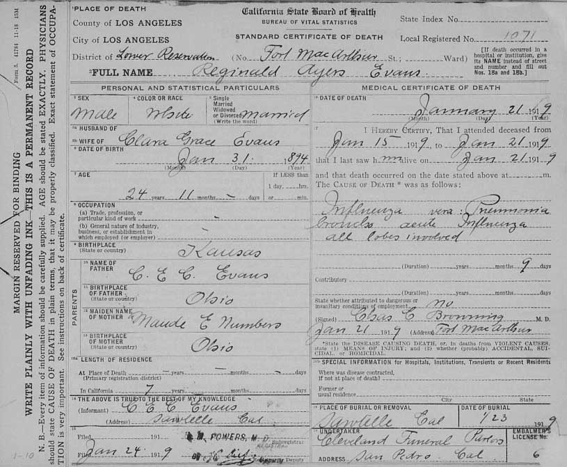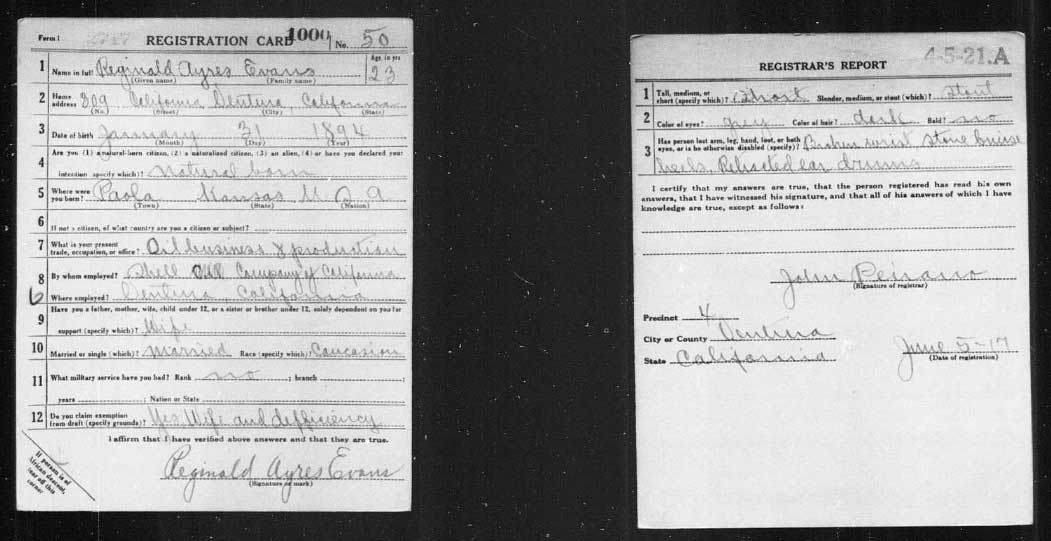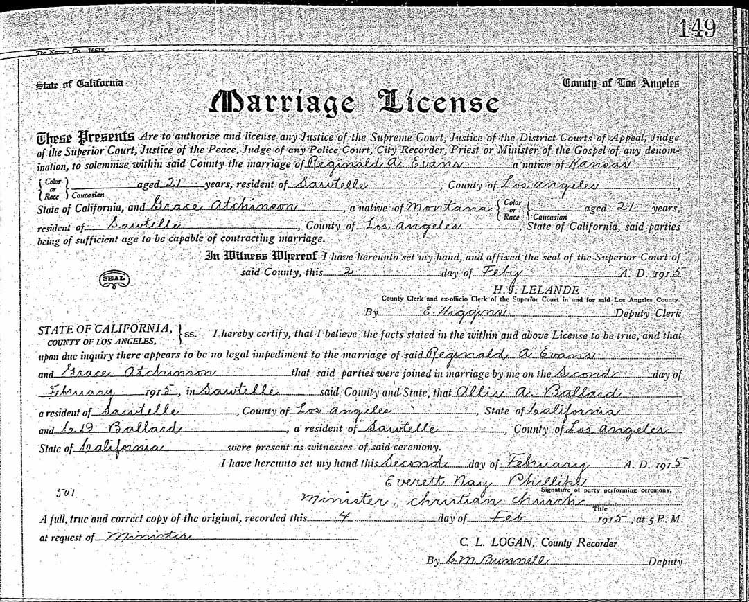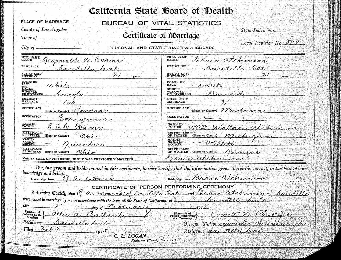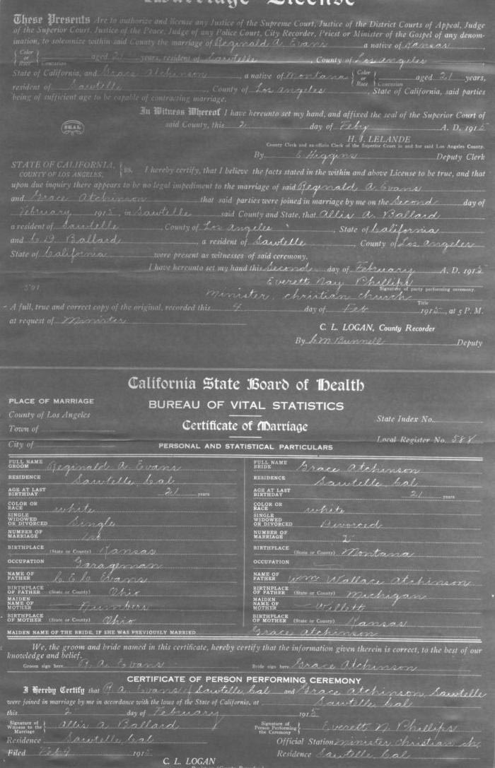 On February 2, 1915, she married Reginald Ayres Evans (January 31, 1894, Paola, Kansas