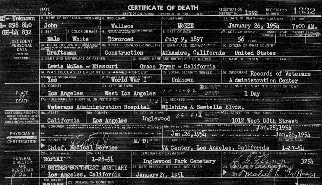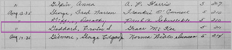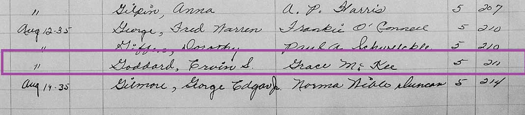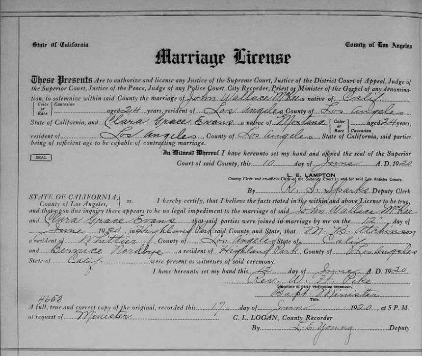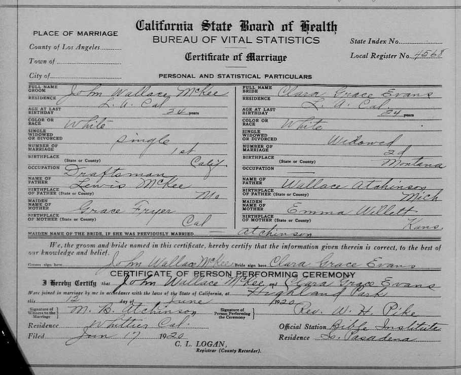 On June 12, 1920, Grace married in Los Angeles, John Wallace McKee, a draftsman (July 9, 1897,