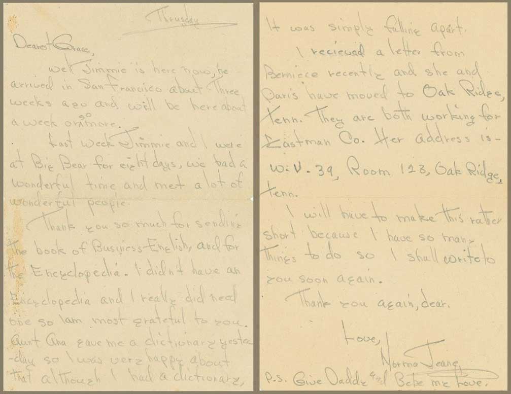 "Of course I know that if it hadn't been for you we might not have ever been married and I know I owe you a lot for that fact alone, besides countless others....I love Jimmie just more than anyone (..) and I know I shall never be happy with anyone else as long as I live and I know he feels the same towards me. So you see we are really very happy together that is of course when we can be together. We both miss each other terribly".