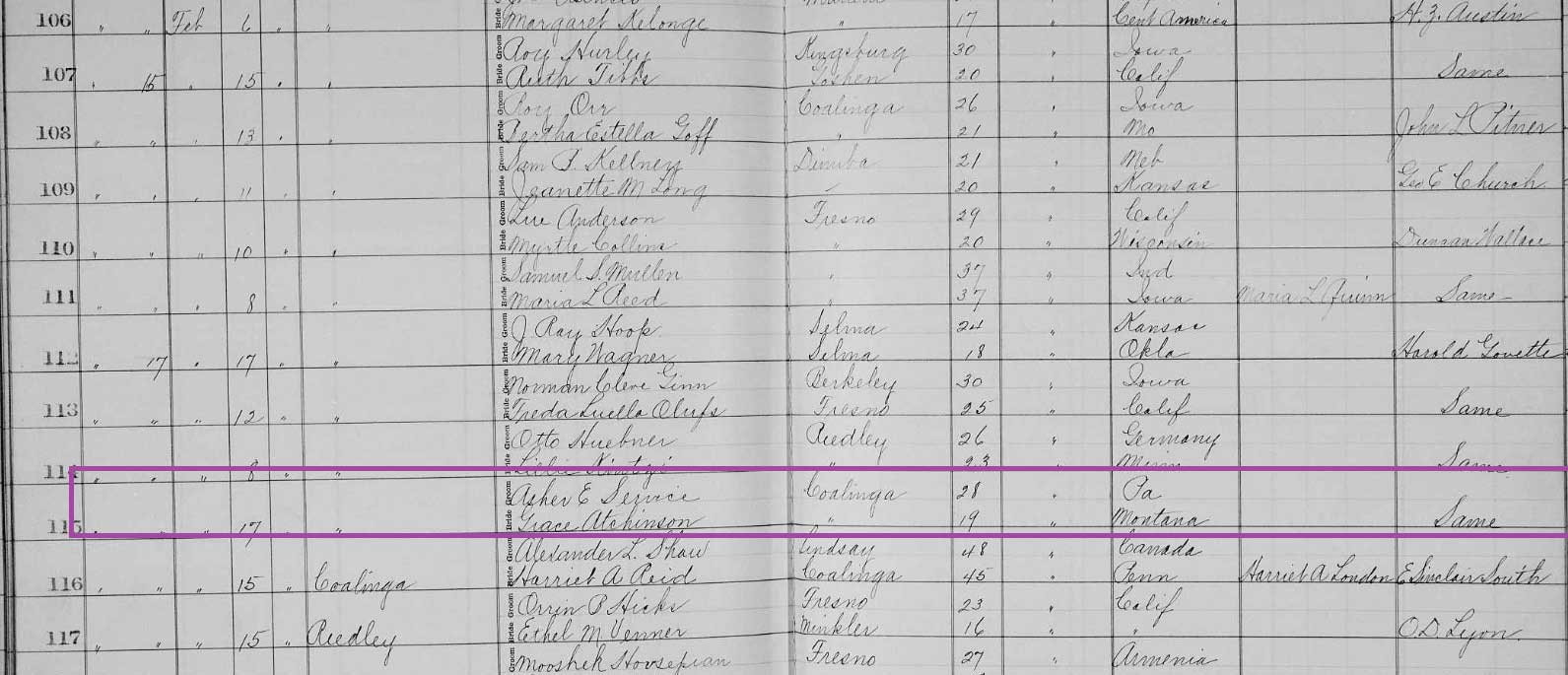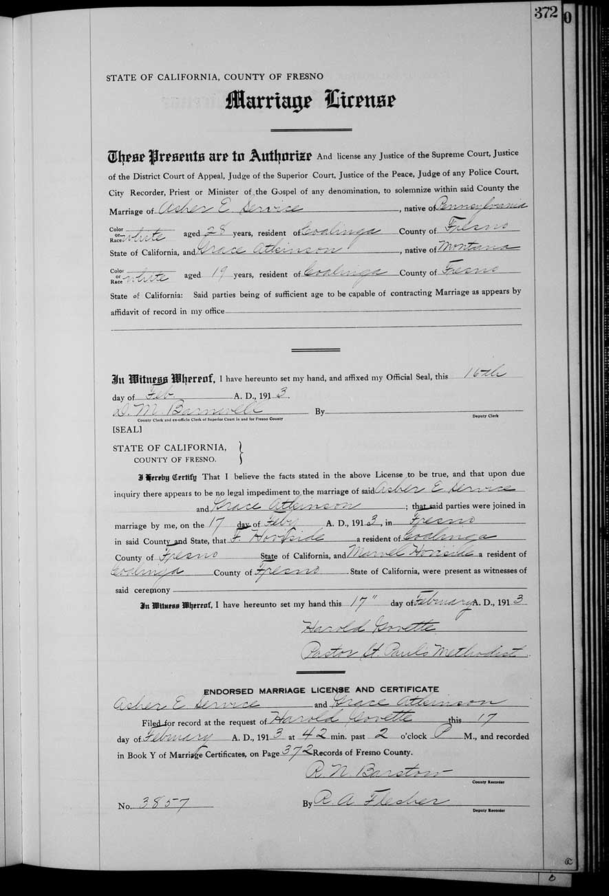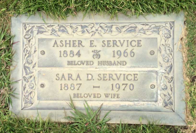 On February 17, 1913, she married Asher Ewing Service (November 6, 1884, Pennsylvania-May 29, 1966, Los