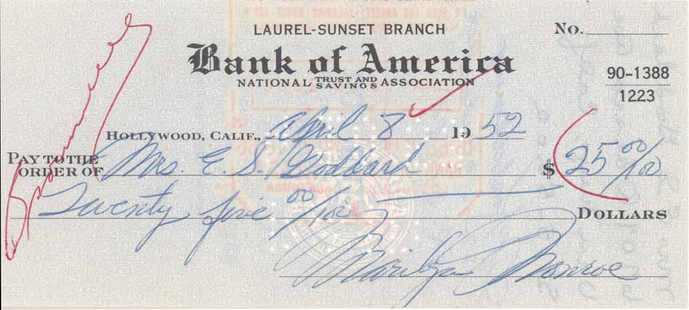 Check from Marilyn to "Mrs E.S.Goddard" dated April 8, 1952 : .