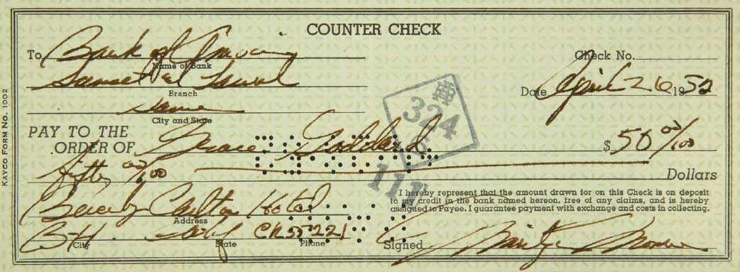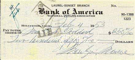 Check from Marilyn to "Grace Goddard" dated April 26, 1952 : .