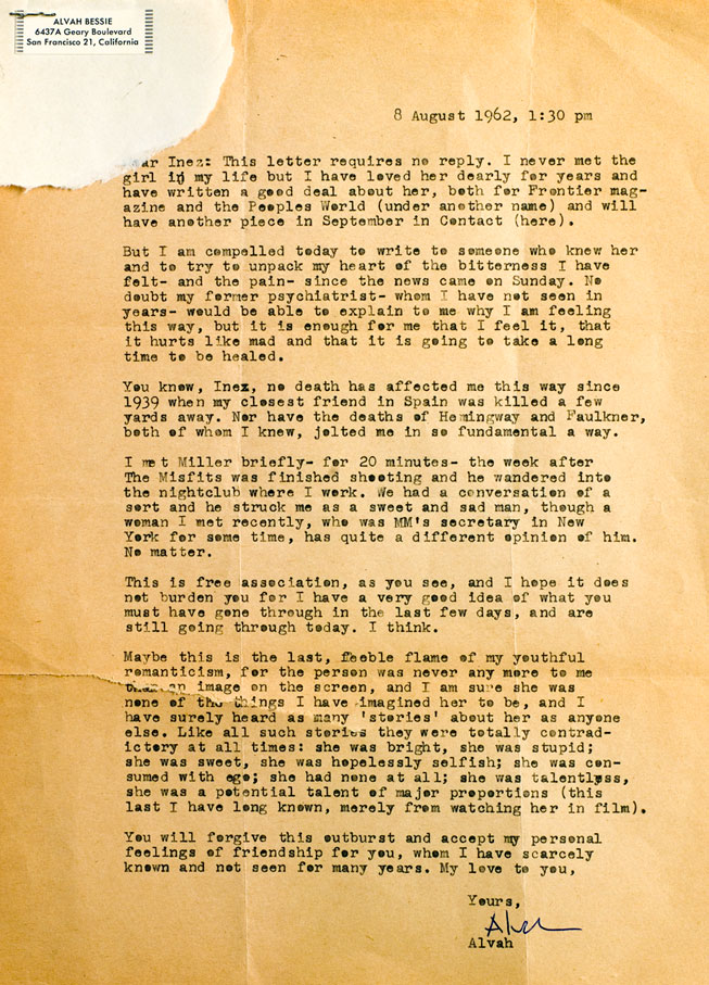 Letter of Alvah Bessie, screenwriter dated August 8, 1962 .