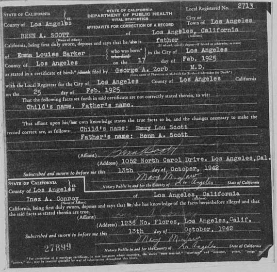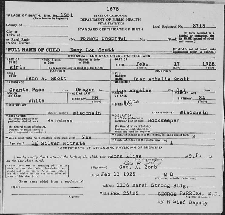 On February 17, 1925, birth of Inez' daughter Emma Louise Barker (Emmy Lou Scott)(,