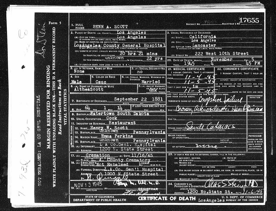 ). The father was Benjamin Arthur Scott (September 22, 1881 or 1886, South Dakota or