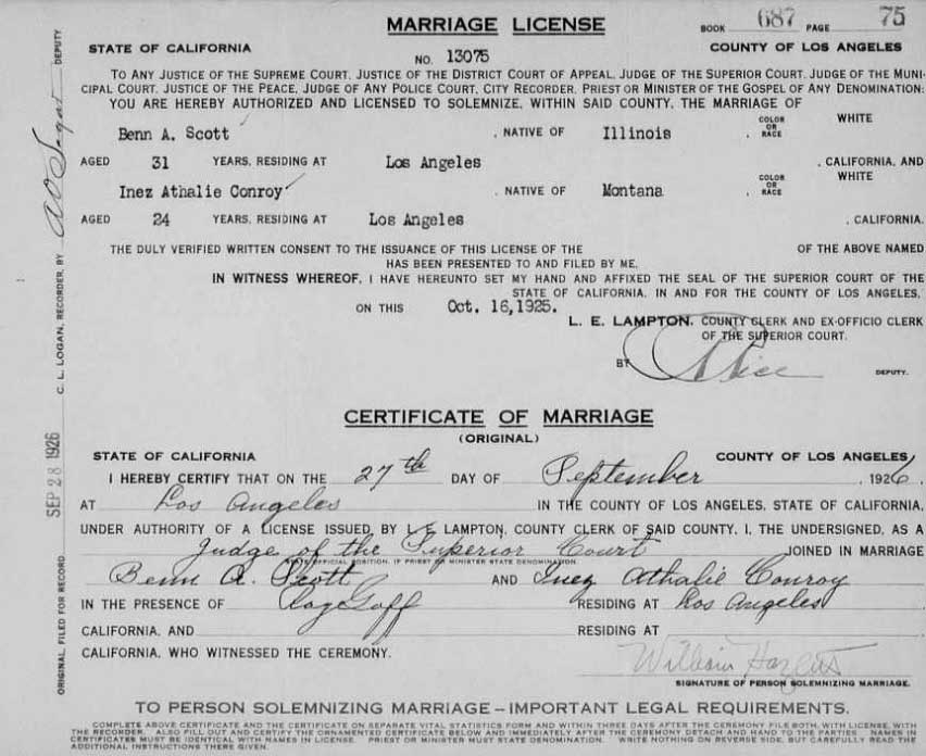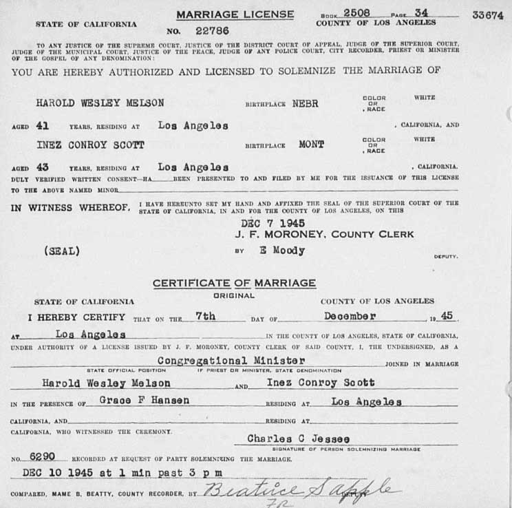 Benn A. Scott died on November 5, 1945. On the marriage certificate with Harold Melson (December 1945), Inez was named Scott, widowed, her address is the one of Benn Scott's former house.