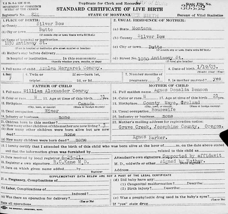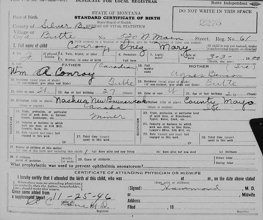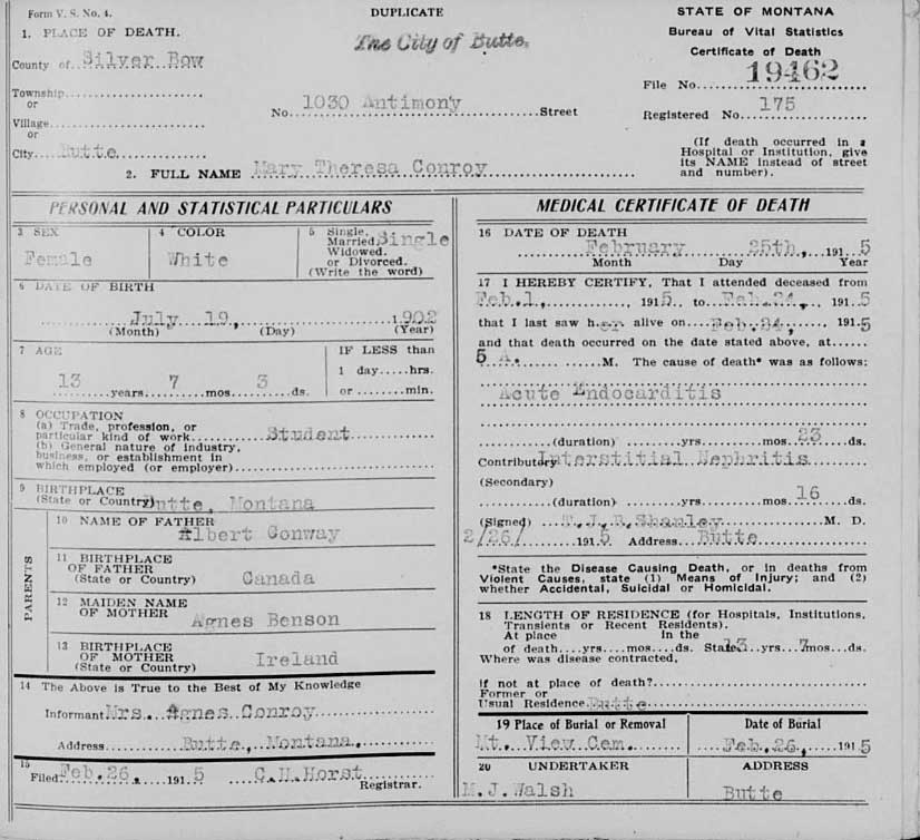 * Mary Teresa (July 19, 1902, Montana-February 26, 1926, Montana)()