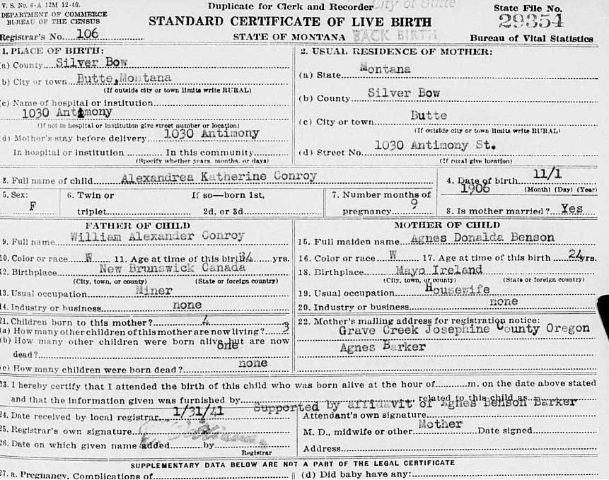 Her parents William Alexander Conroy (January 1873, New Brunswick, Canada) and Agnes Donalda Benson