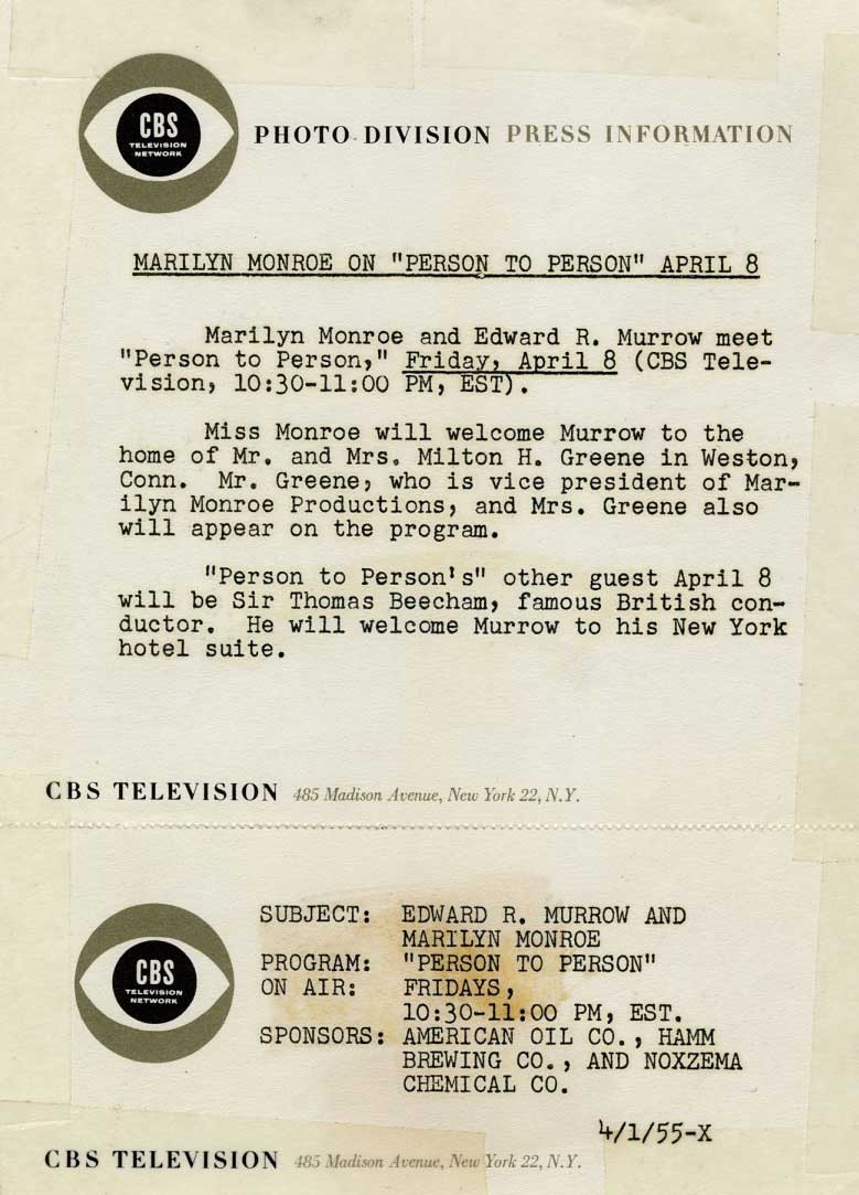 On April 8, 1955 Marilyn appeared in "Person to Person", presented by Edward R.Murrow, on CBS (Columbia Broadcasting System).
