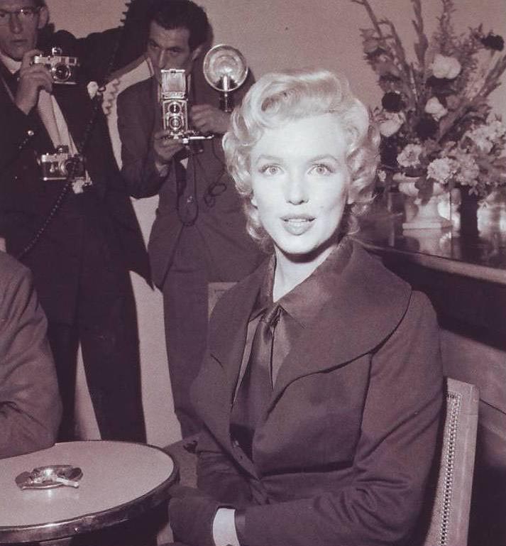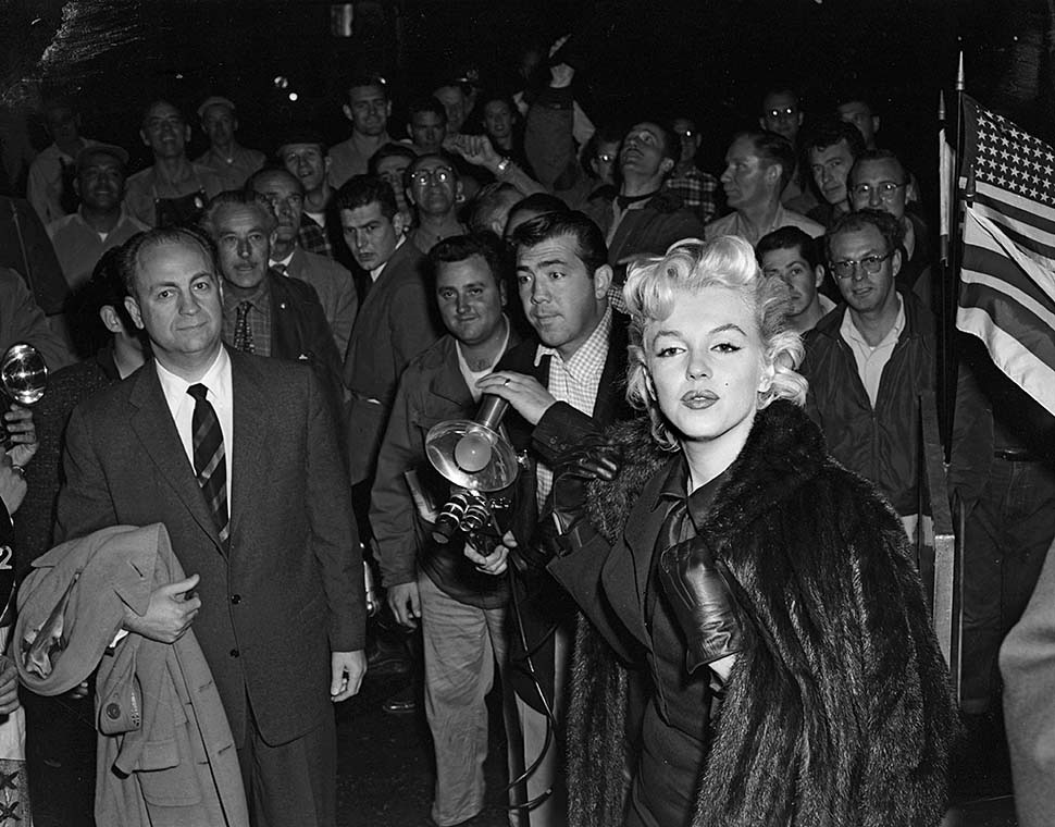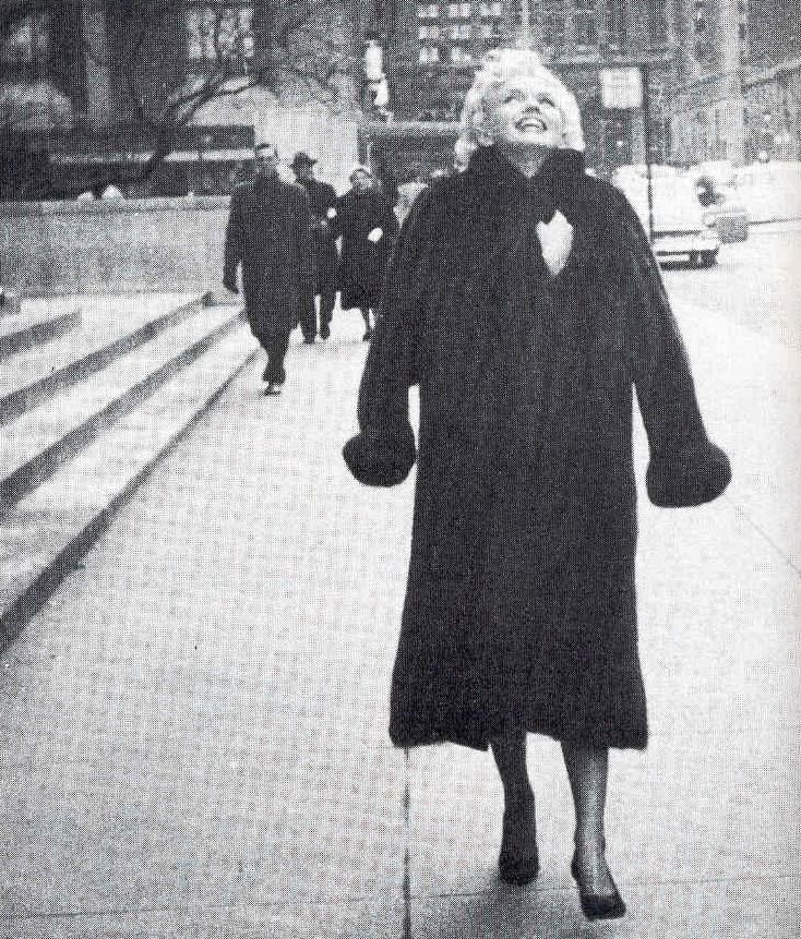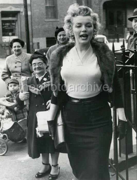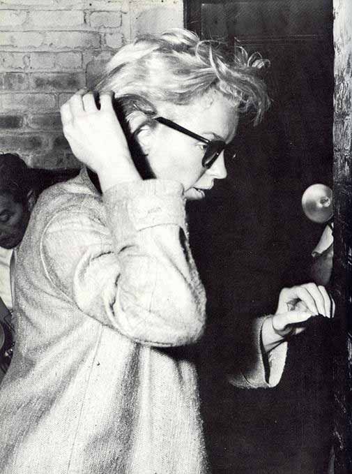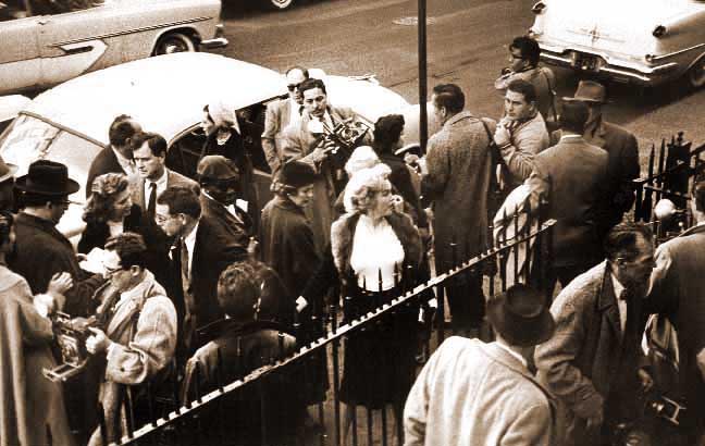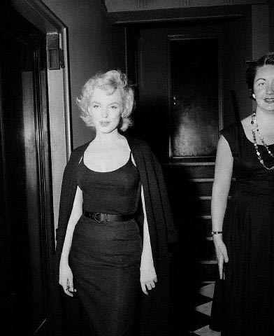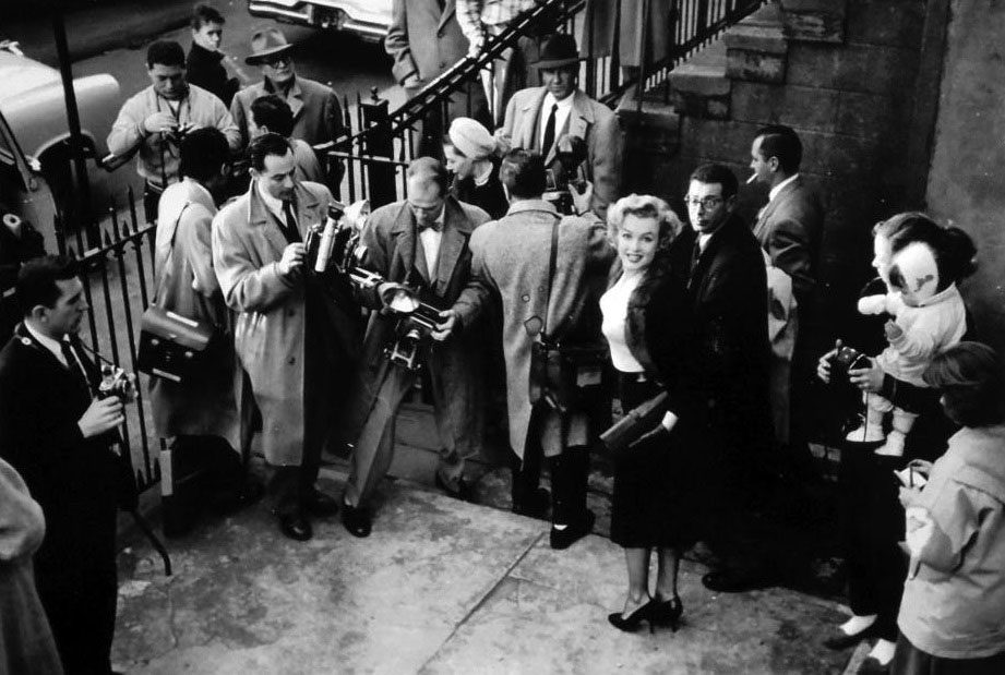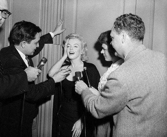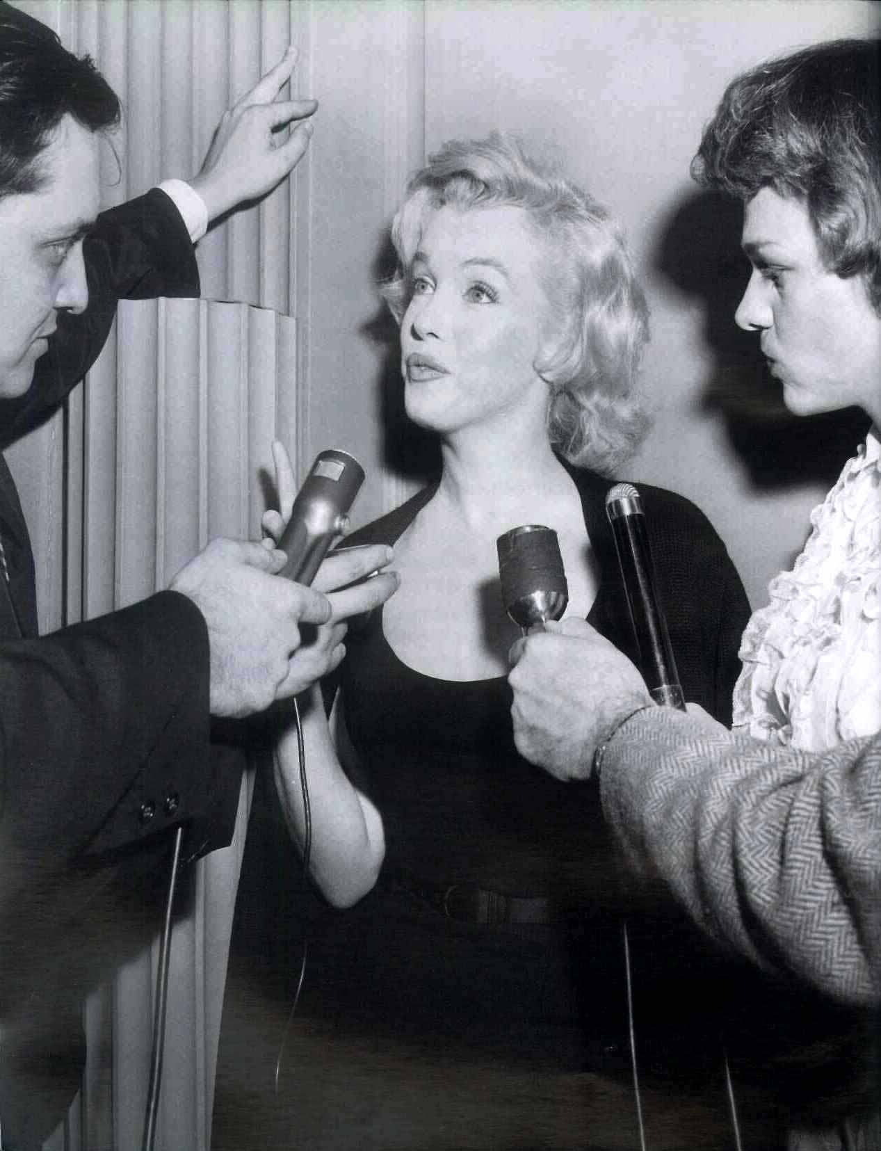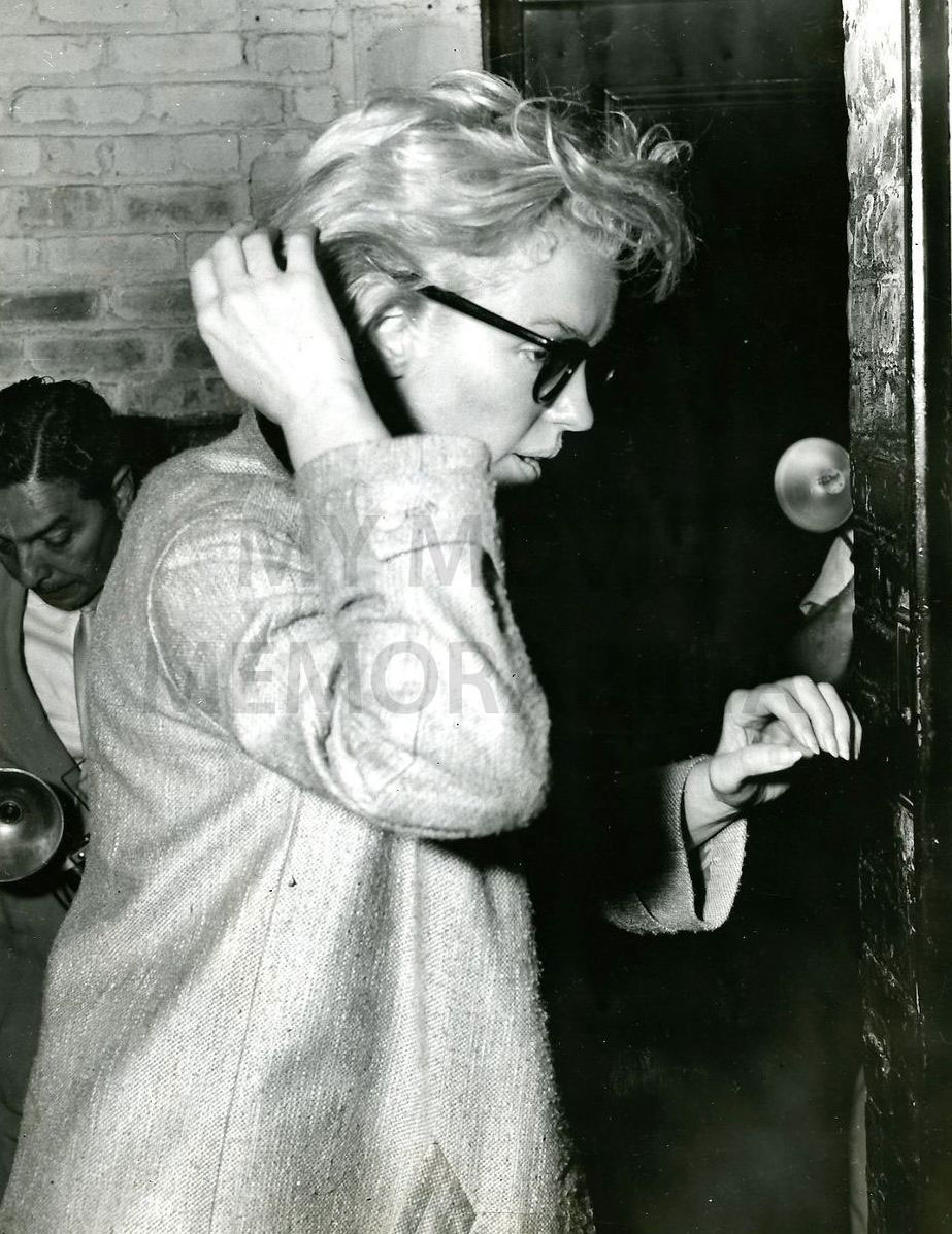 June 21, 1956, the reporters plaguing her, in the lobby of her building -