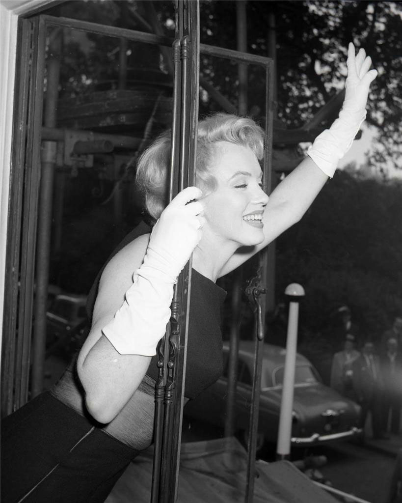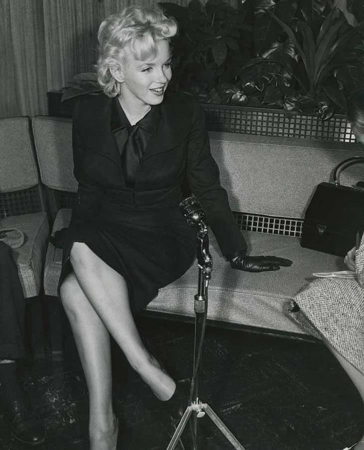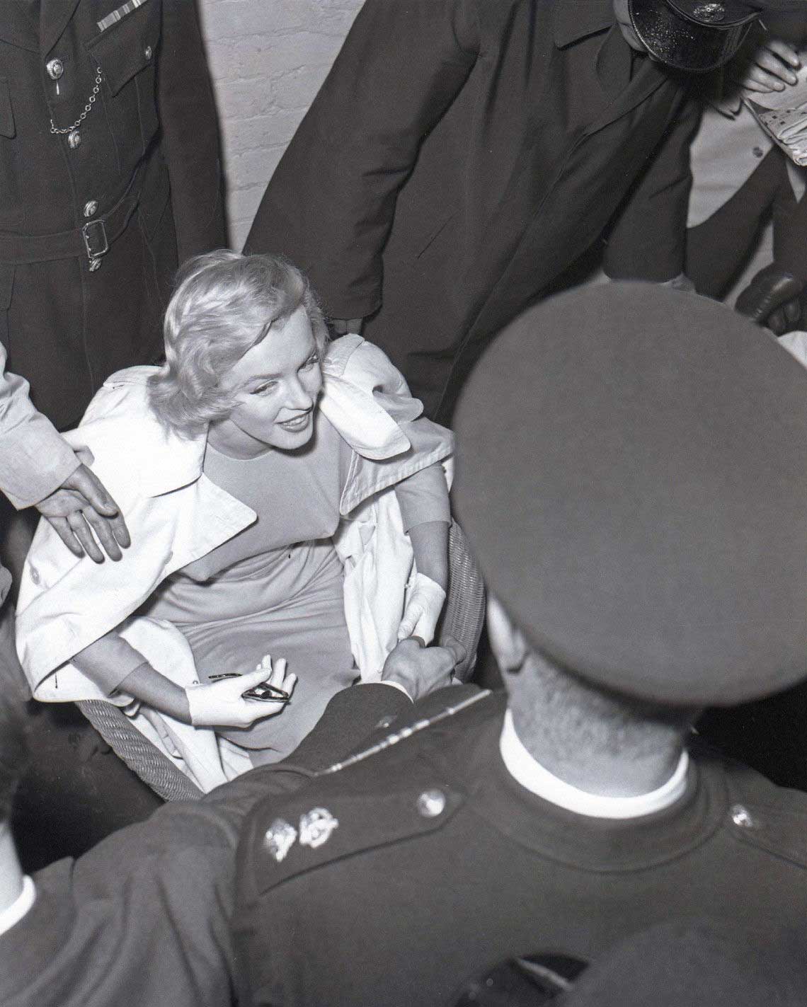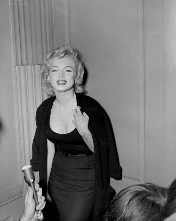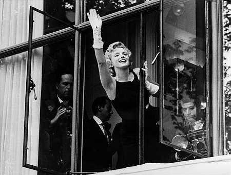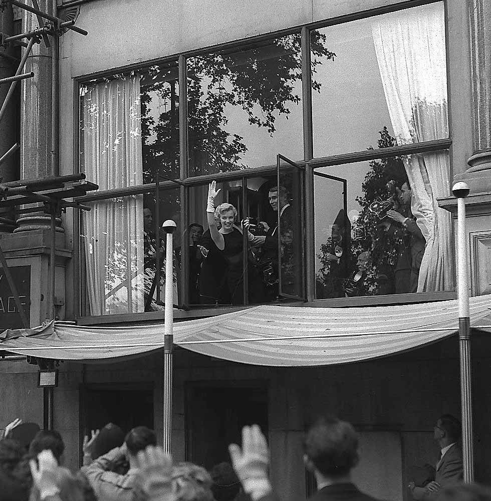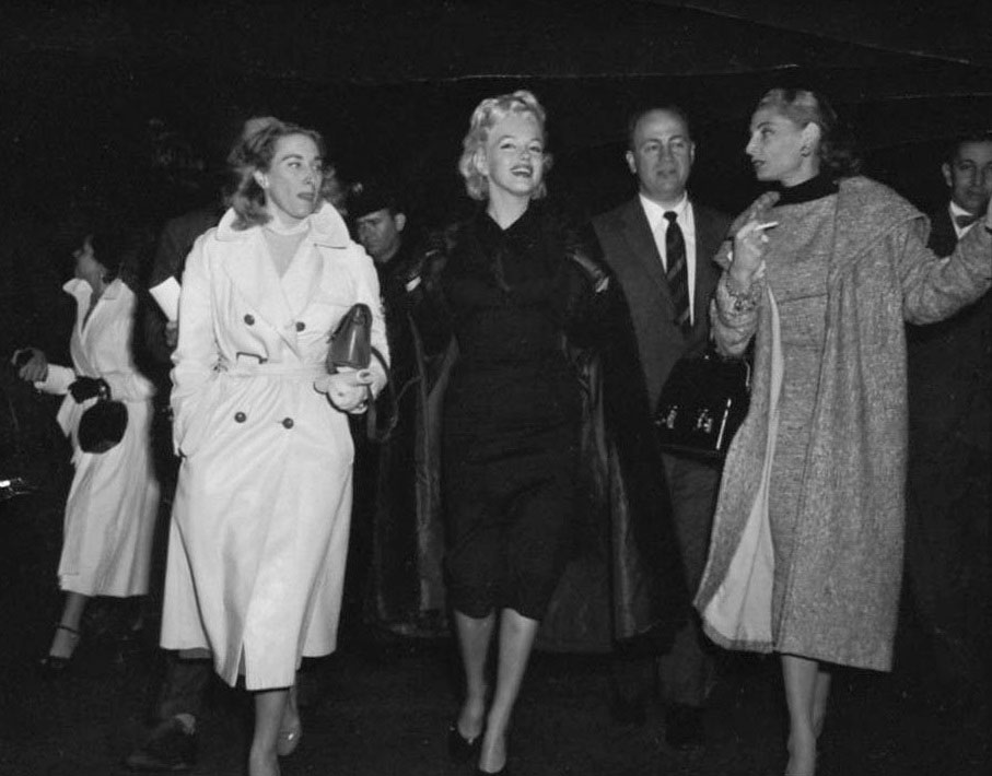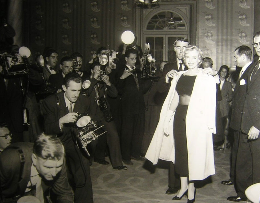 June 21, 1956, the reporters plaguing her, in the lobby of her building -