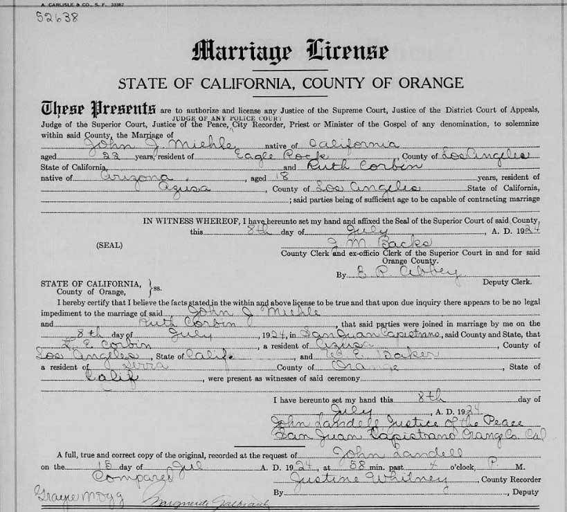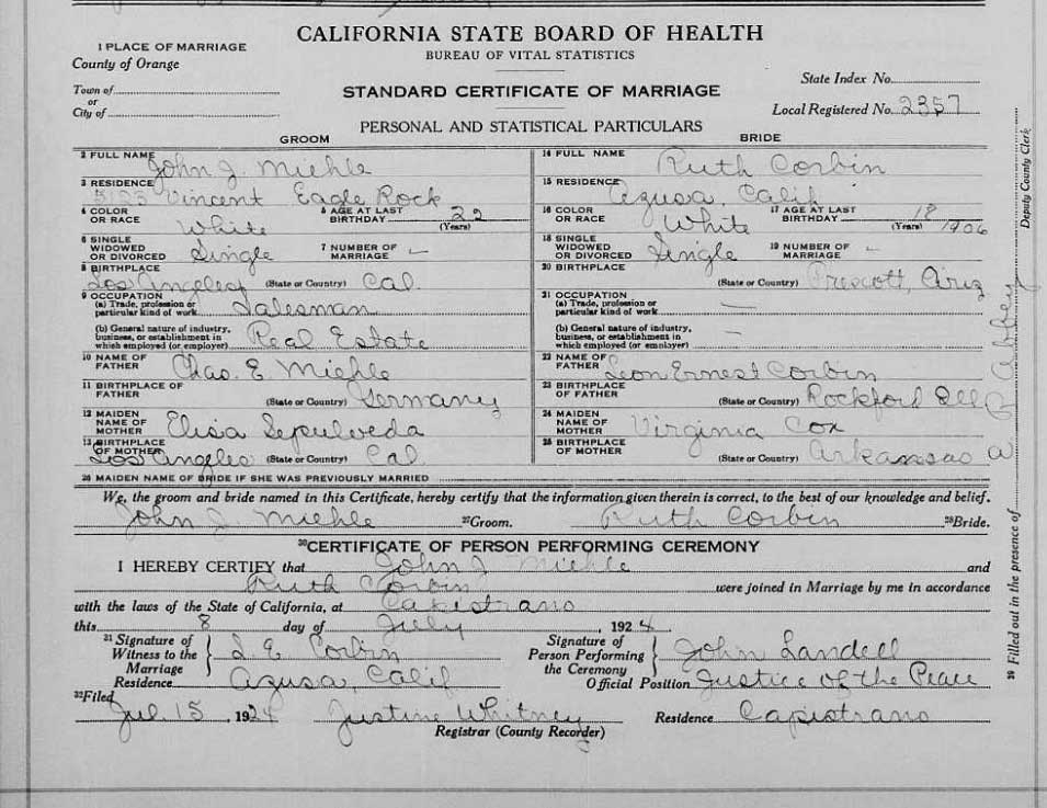 Le 8 juillet 1924 à Los Angeles, il épousa Ruth Emilie Corbin (30 juillet 1906, Arizona-1er octobre 1986,