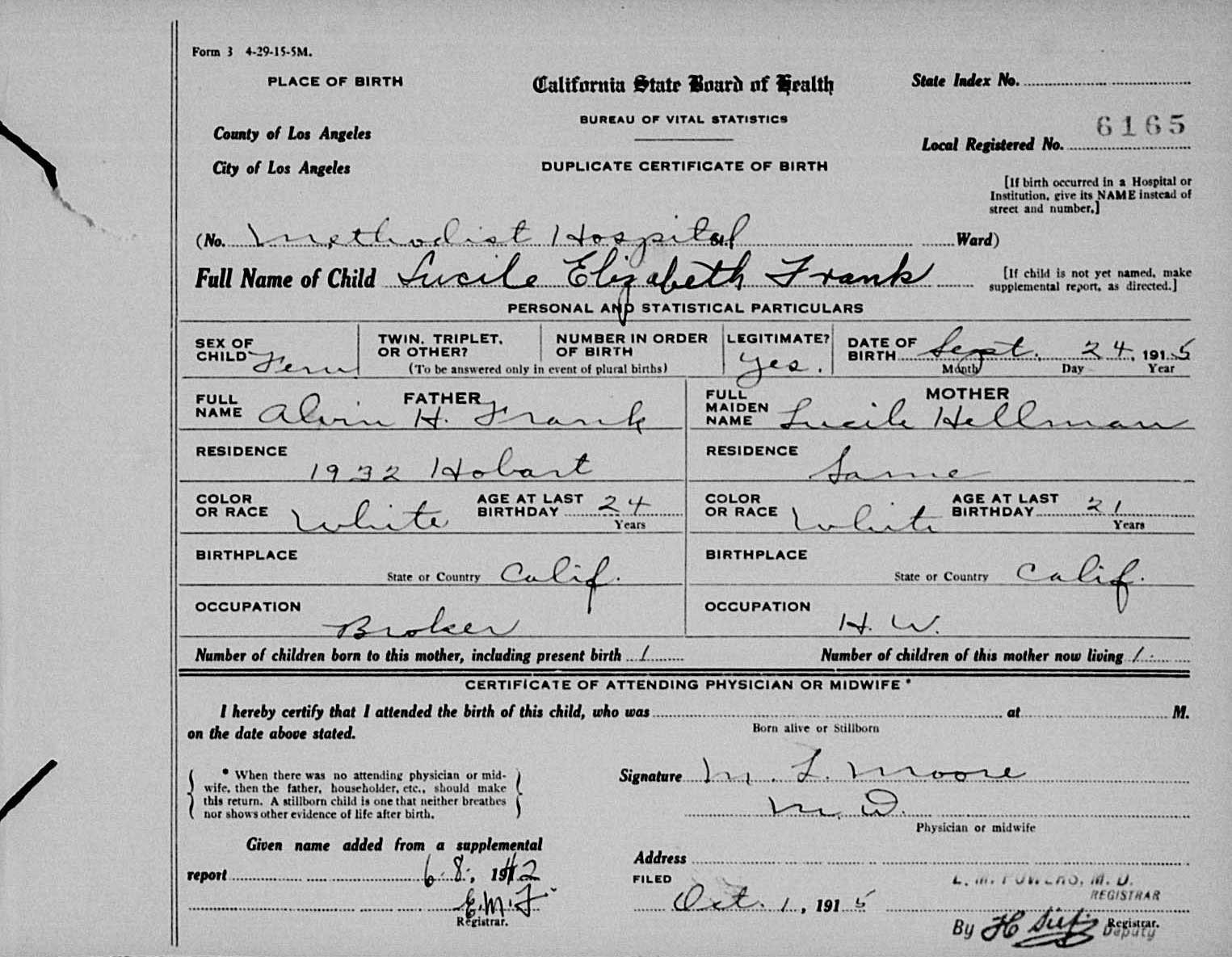 * 1950 : 618 Thayer Avenue, Los Angeles ()
