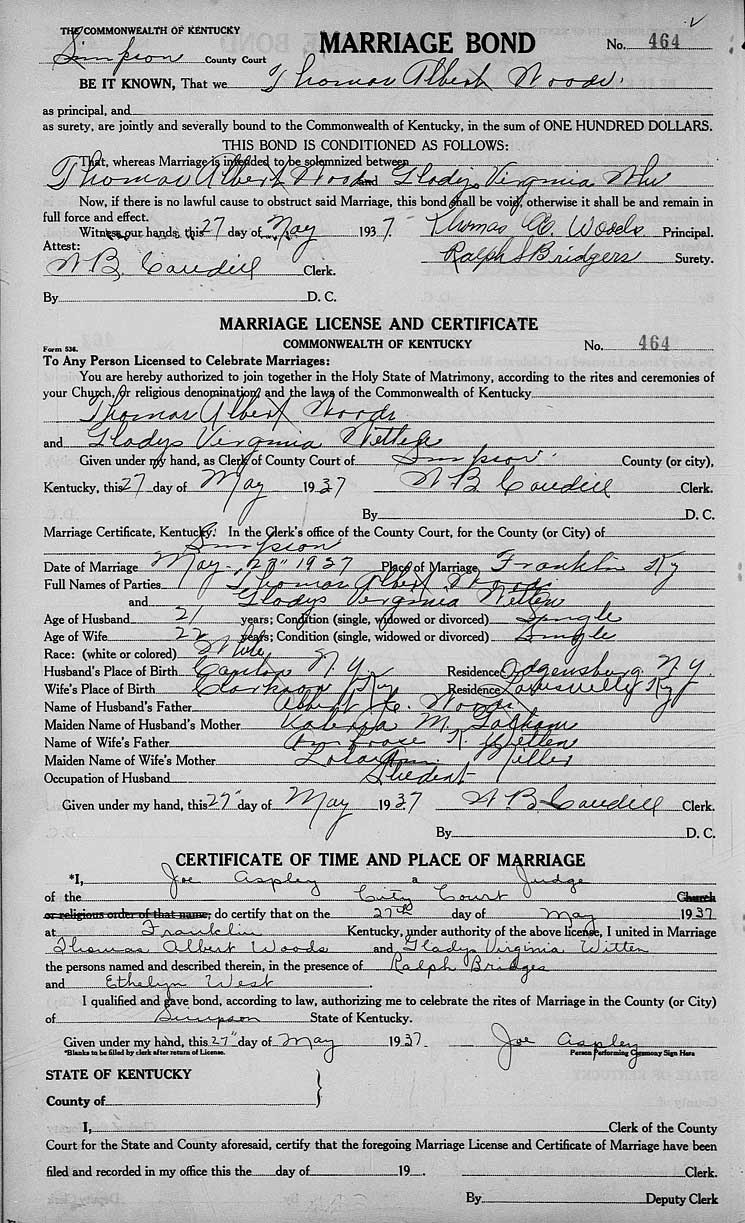 On May 22, 1937 she married Thomas Albert Woods, in Kentucky (). They divorced before 1940.