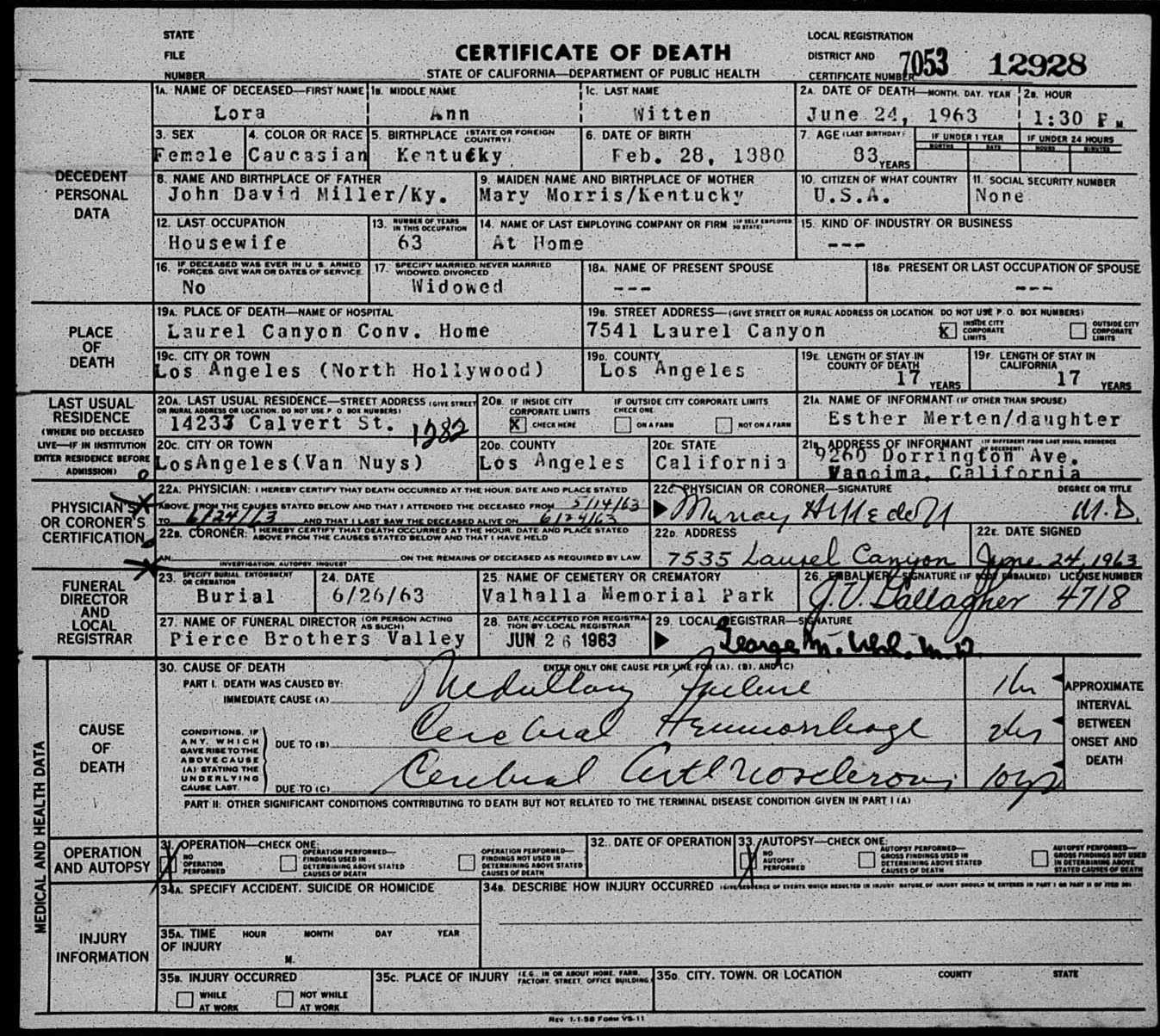 Her parents were Ambrose King Witten (February 27, 1880, Kentucky-March 1, 1924, Kentucky) and Lora