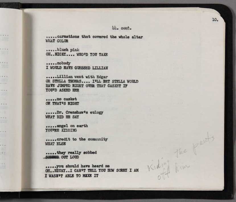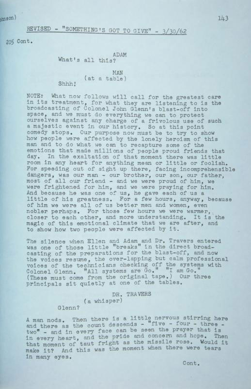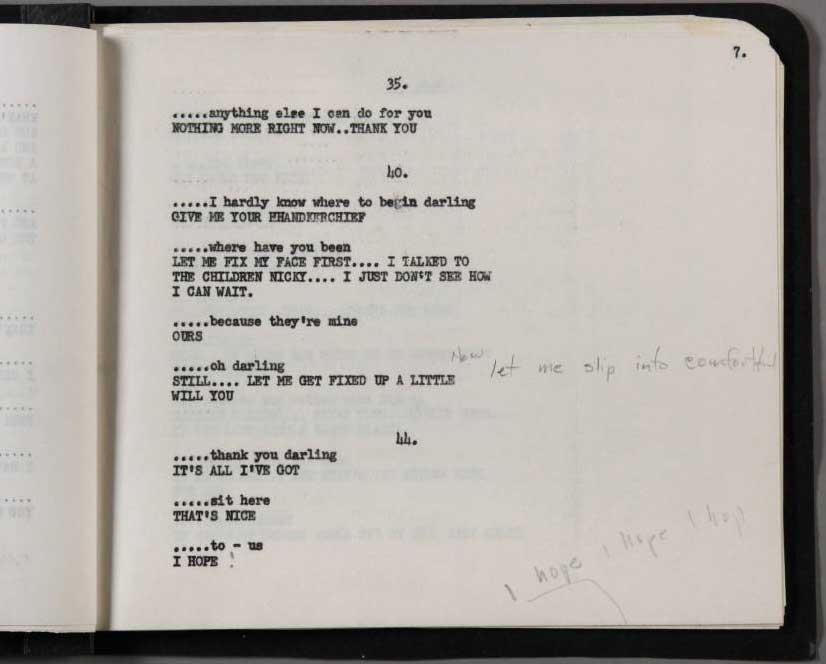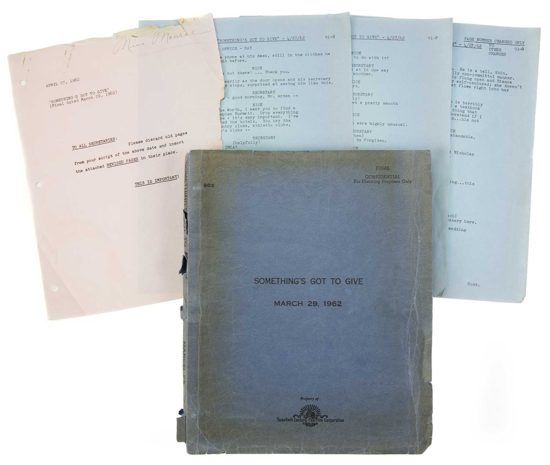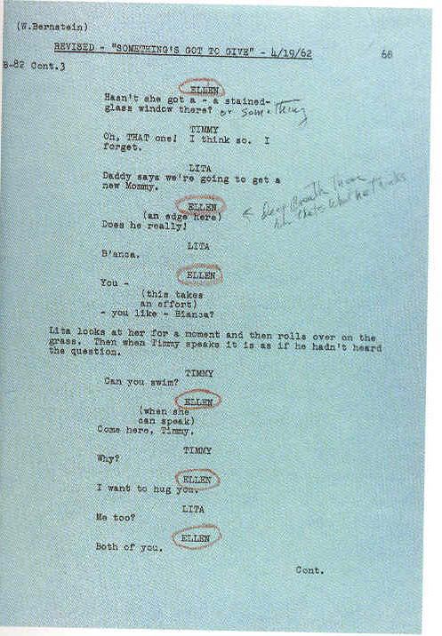 During the shooting, the original screenplay was still rewritten; some Marilyn's suggestions were inserted, and every pages, except 4, were modified in a way or in another. At a moment, the studio tried to make believe to Marilyn that thescreenplay hadn't changed - she regretted that the changings spoiled the version she prefered - by giving her the rewritten pages on white paper, than on the usual revision blue pages.