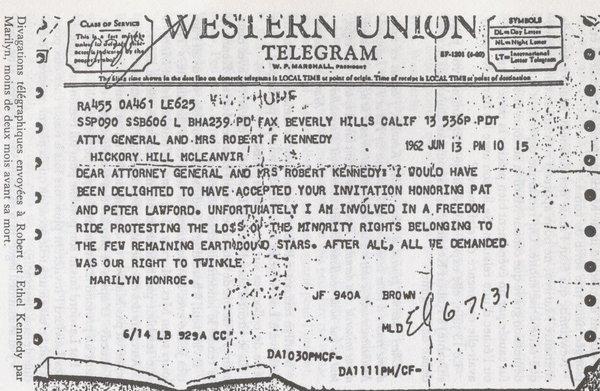 Marilyn fought to be reinstated in the movie. As she wrote it in a telegram to Robert Kennedy and his wife, who had invited her to visit them in Virginia : "I would have been delighted to have accepted your invitation honoring Pat and Peter Lawford. Unfortunately I am involved in a freedom ride protesting the loss of the minority rights belonging to the few remaining earthbound stars. After all, all we demanded was our right to twinkle".