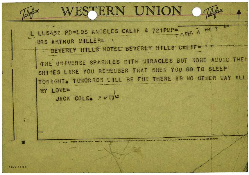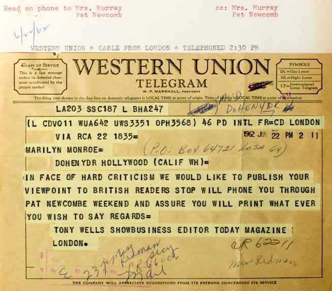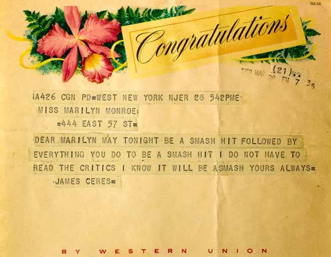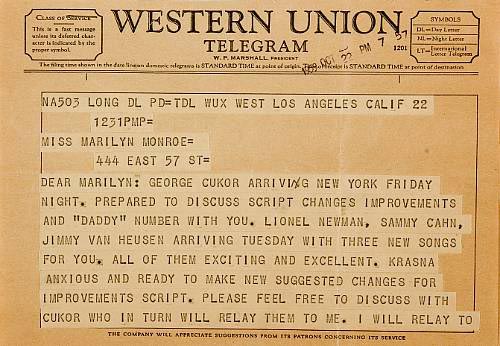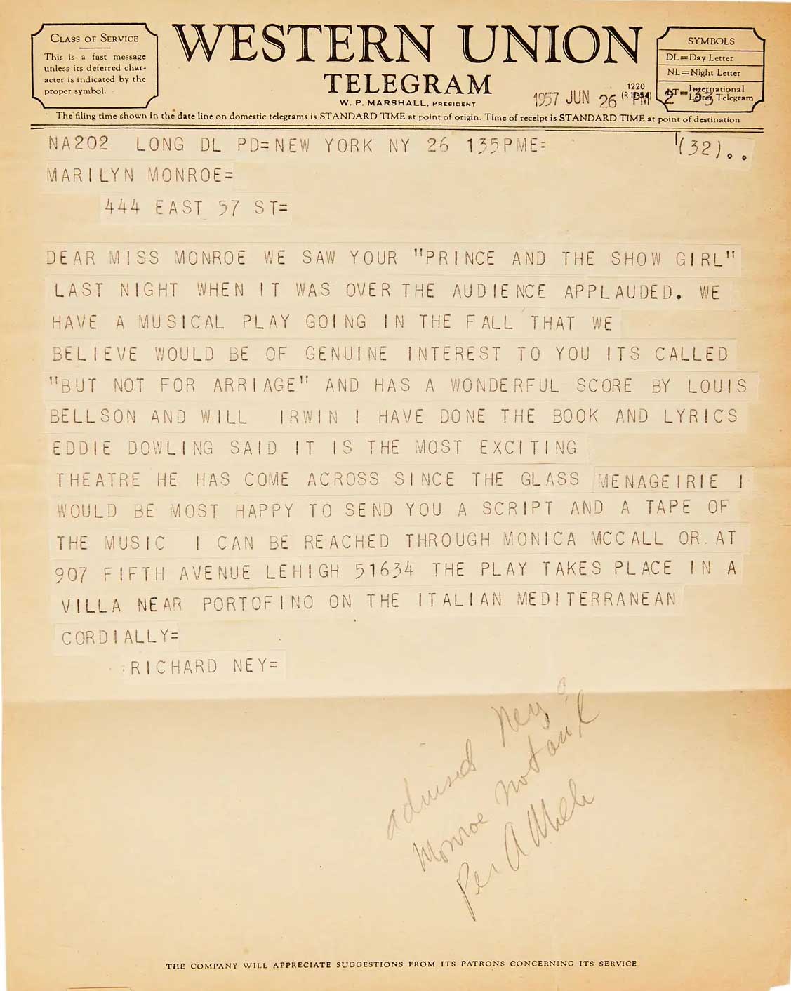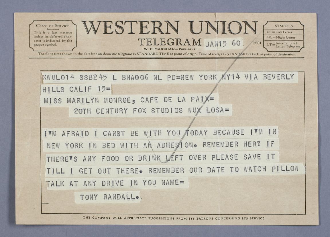 Telegram dated January 15, 1960 sent from Tony Randall, her partner in "Let's Make Love",who couldn't attend the movie presentation press conference