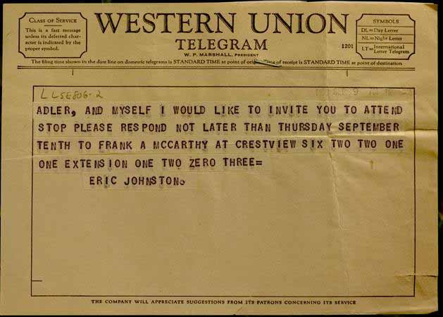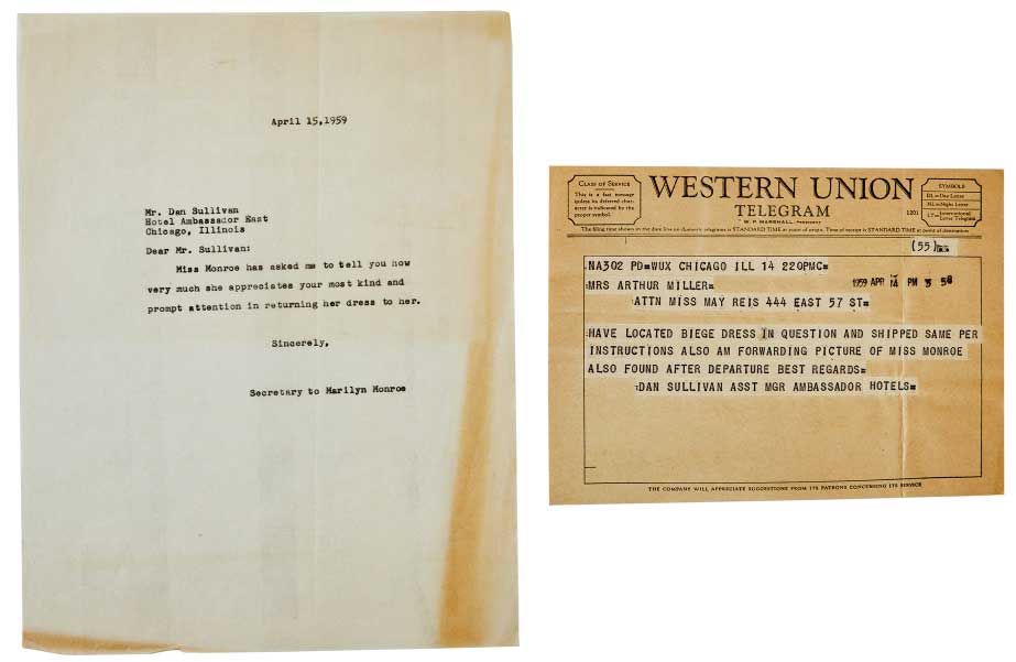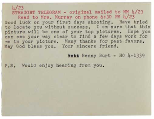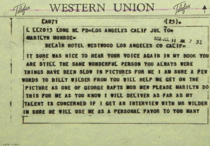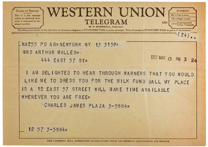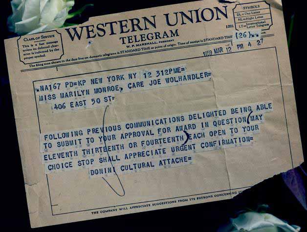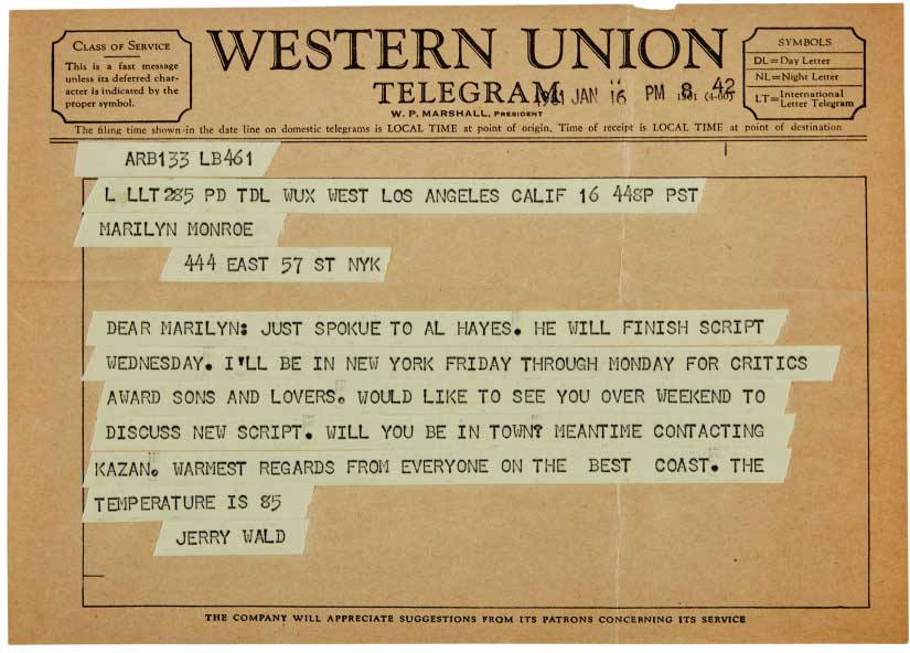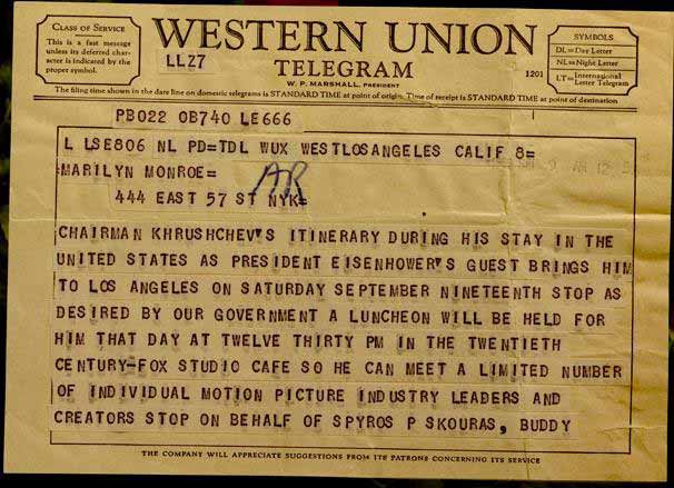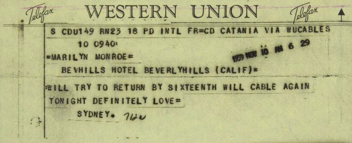 Telegram dated January 15, 1960 sent from Tony Randall, her partner in "Let's Make Love",who couldn't attend the movie presentation press conference