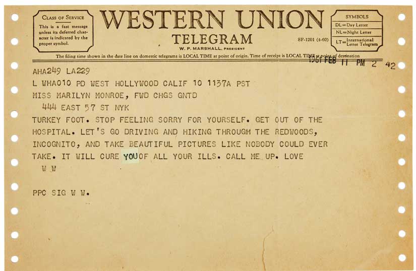 Telegram from Marlon Brando dated from February 27, 1961, during Marilyn's hospitalization at the Columbia