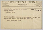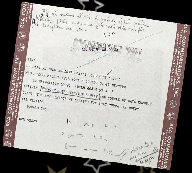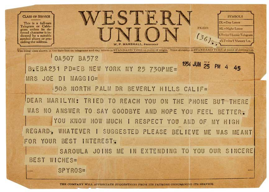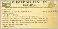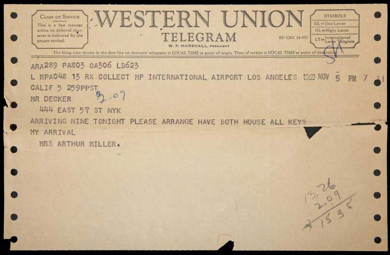 Telegram dated November 5, 1960 Marilyn sent to Mr Decker, her building's guard, announcing her arrival