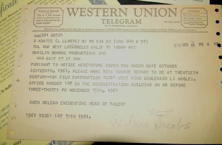 Telegram dated November 15, 1961 sent to the Marilyn Monroe Productions from Owen Nolean, executive