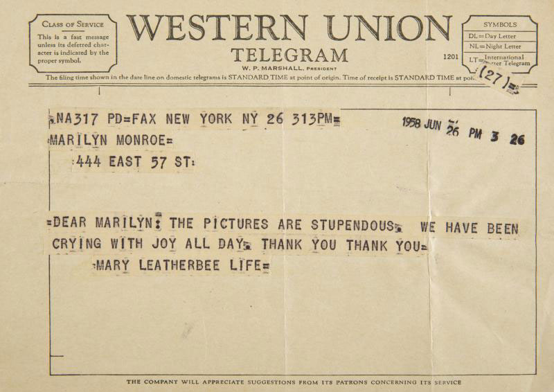 Telegram dated June 26, 1958 sent from Mary Leatherbee from Life magazine