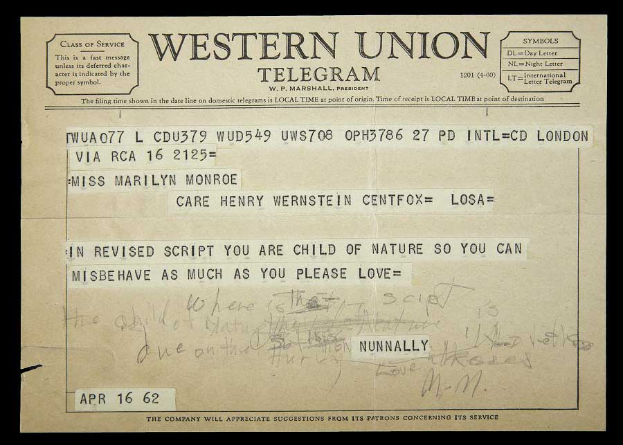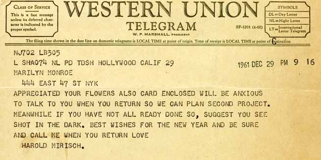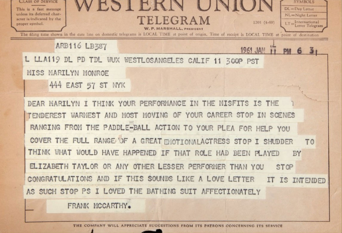 Telegram dated January 11, 1961 sent to Marilyn by producer Frank Mccarthy, about her performance in "The