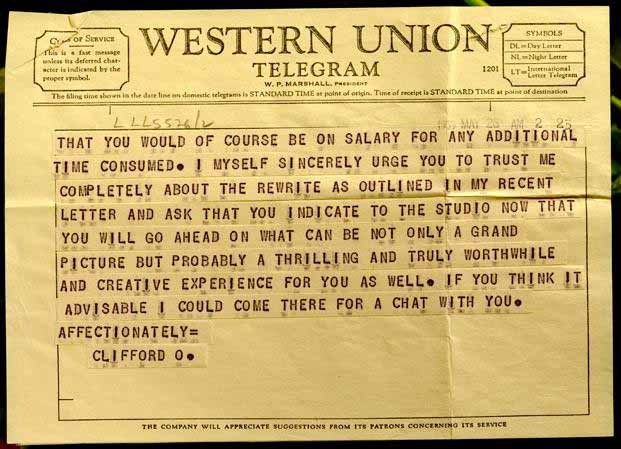 Telegram dated May 28, 1959 sent from Clifford Odets
