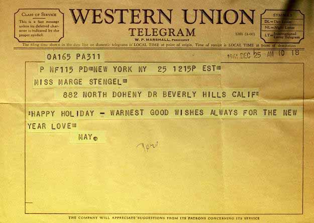 Telegram dated December 25, 1961 sent from May Reis to Marilyn (under the name of Marge Stengel she