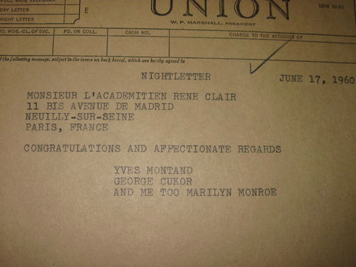 Telegram dated June 17, 1960 sent to René Clair, in France