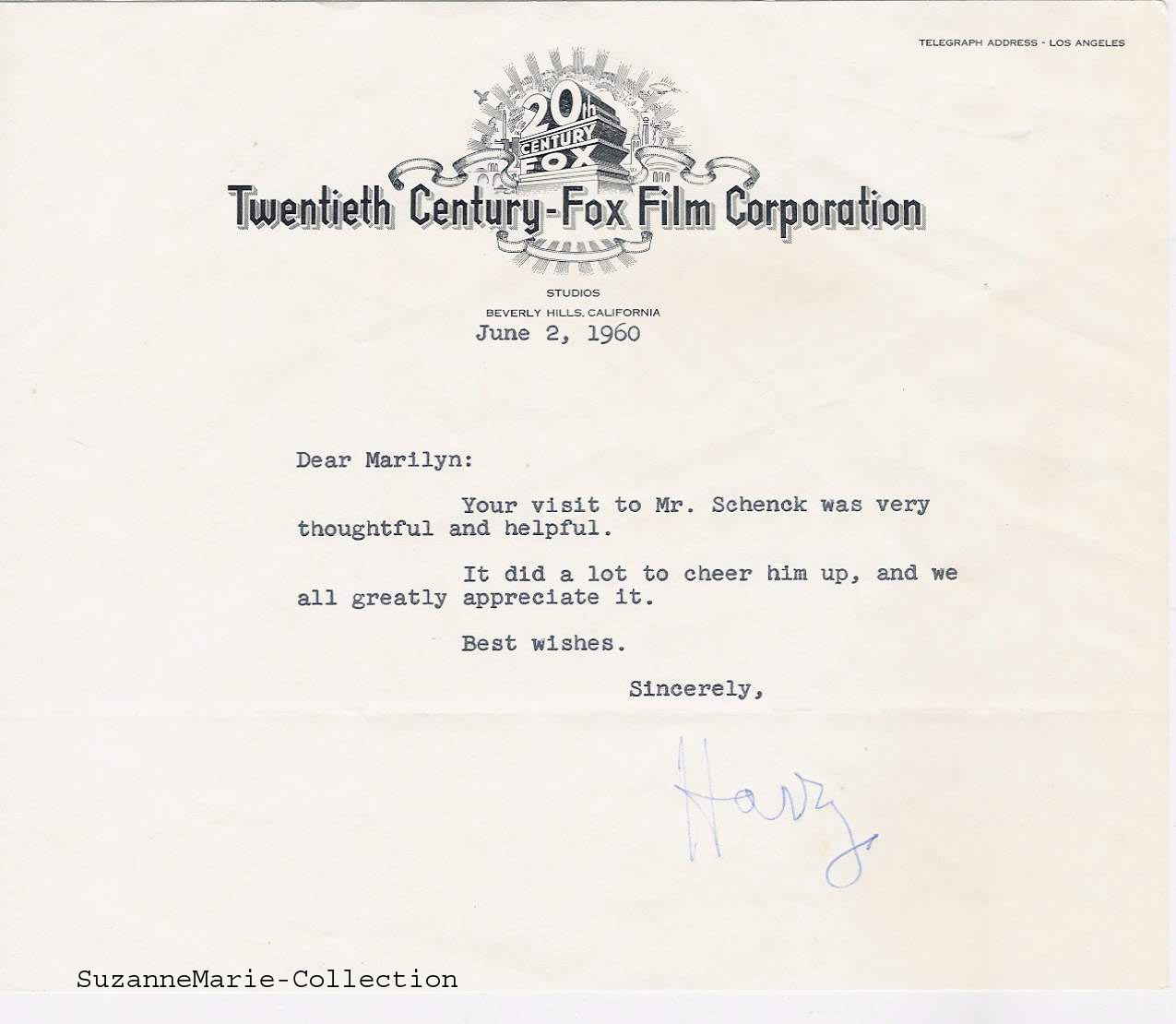 Telegram dated June 2, 1960 sent from the Fox to thank her for her visit to Joe Schenck, unwell