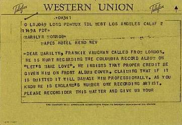 Telegram from 1960 sent to Marilyn from Jerry Wald; Frankie Vaughan, her partner in "Let's Make Love" felt wronged because his name didn't appear on the movie songs record;Wald asked Marilyn to reconsider the