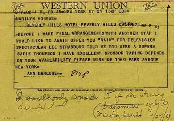 Telegram dated June 27, 1961 sent to Marilyn from Ann Marlow, asking her if she wanted to play in the TV version of "Rain"; Marilyn's answer, annotated by her secretary : "I would reconsider the thing only if Lee